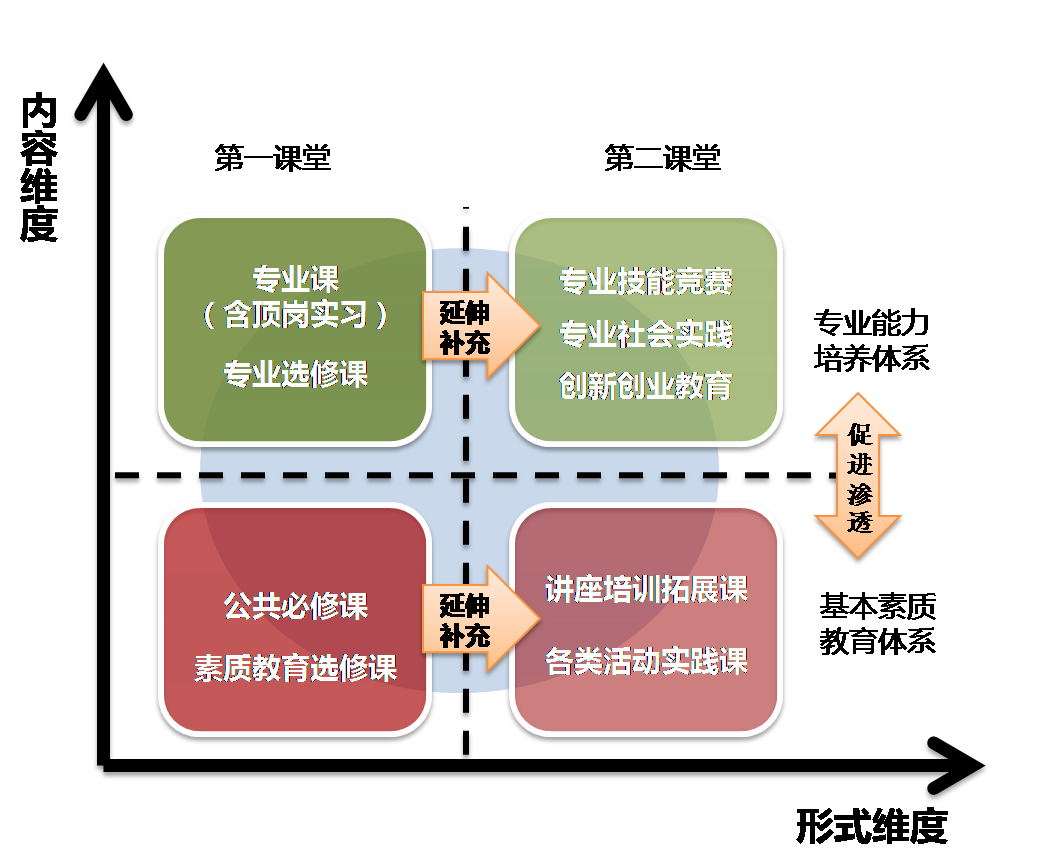 基本素质 教育体系 | 1.公共必修课 思想道德类课程 职业素质类课程 身心健康类课程 应用基础类课程 2.素质教育选修课 | 职业道德训练模块 心理素质教育模块 核心能力训练模块 身体素质教育模块 就业创业训练模块 人文素质教育模块 创新教育训练模块 实践综合训练模块 |