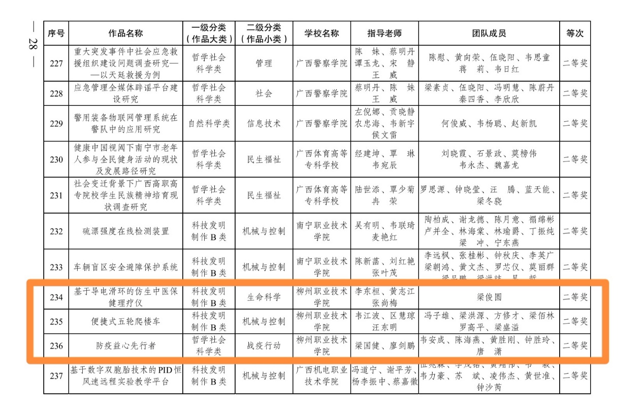 新闻网消息(文/创新创业学院 许明、袁诗铭 图/创新创业学院 许明、袁诗铭)根据桂青联发〔2021〕19号关于公布第十届“挑战杯”广西大学生 课外学术科技作品竞赛获奖名单的通知获悉,柳州职业技术学院学生获得一等奖两项,二等奖三项,三等奖七项。