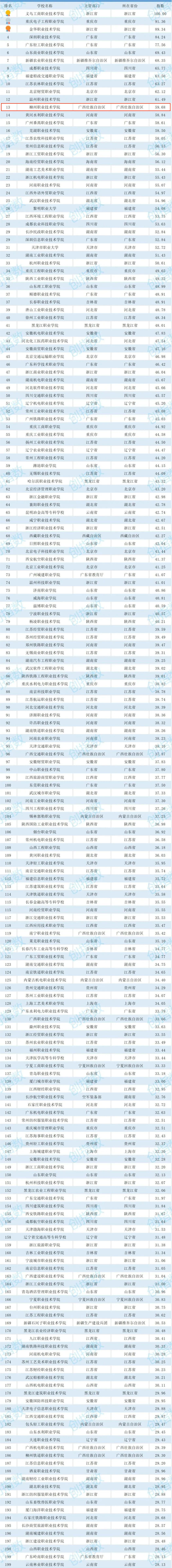 榜单显示,柳州职业技术学院在2022年中国高职(专科)院校创新创业教育指数榜中位列第十三。成功入围全国前十五强。