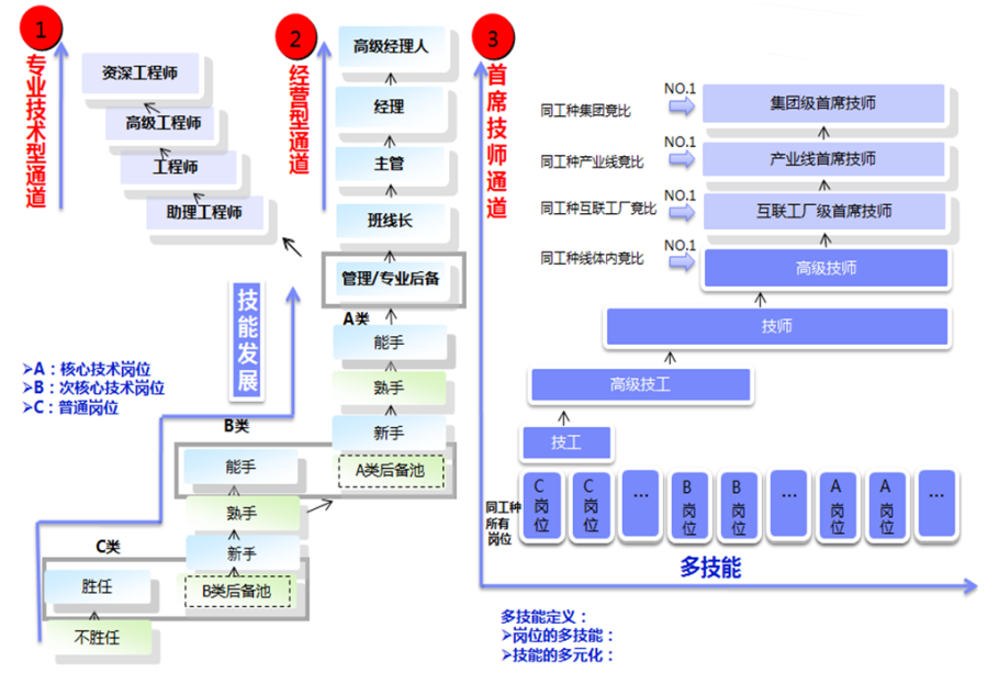海尔的人才观:人人是人才,赛马不相马;目前海尔为员工的职业发展提供”2+1”条职业发展通道:管理经营型、专业技术型和首席技师型发展通道。其中管理通道分为:基层管理(班组长、线长)、中层管理(主管、经理)、中高层管理(高级经理);专业通道分为:助理工程师、工程师、高级工程师、资深工程师;