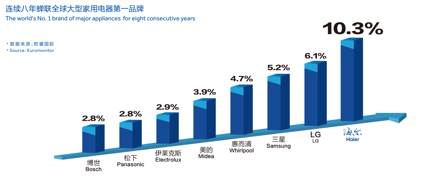 据世界权威市场调查机构欧睿国际(Euromonitor)的数据,海尔大型家用电器2016年品牌零售量占全球市场的10.3%,居全球第一,连续八年蝉联全球白色家电第一品牌。同时,海尔冰箱、洗衣机、冷柜、酒柜的全球品牌份额也分别继续蝉联全球第一。
