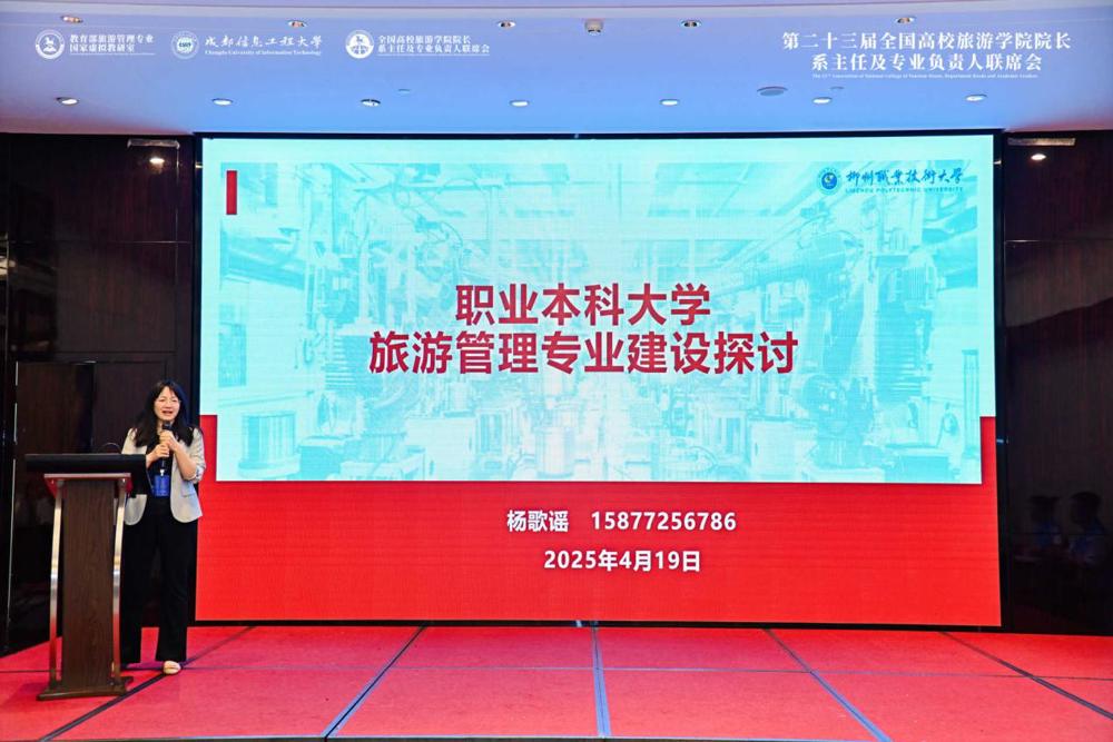 新闻网消息(文/贸易与旅游管理学院 徐娟 图/主办方提供)2025年4月18日至20日,第二十三届全国高校旅游学院院长、系主任及学科带头人联席会在成都召开。我校贸易与旅游管理学院院长杨歌谣受邀参会,并在分会场作题为《职业本科大学旅游管理专业建设探讨》的专题发言。