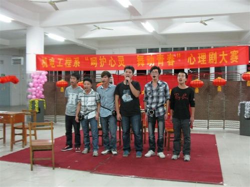 2012年5月25日,机电工程系在学院A区食堂三楼举行“呵护心灵 舞动青春”的心理剧大赛。学院组织部贾洪峰老师、机电工程系分系团委书记莫丽娜、院学生会主席林敏及阳光心理协会会长苏金进以及各班级代表参加此次活动。
