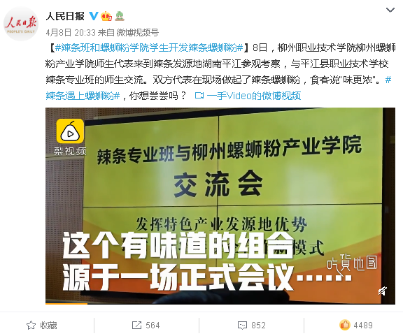 2021年4月8日,人民日报新浪微博以《辣条班和螺蛳粉学院学生开发辣条螺蛳粉》为题,刊发我校新闻。详情点击:https://m.weibo.cn/2803301701/4623808167940559(链接、截图:刘晓燕)