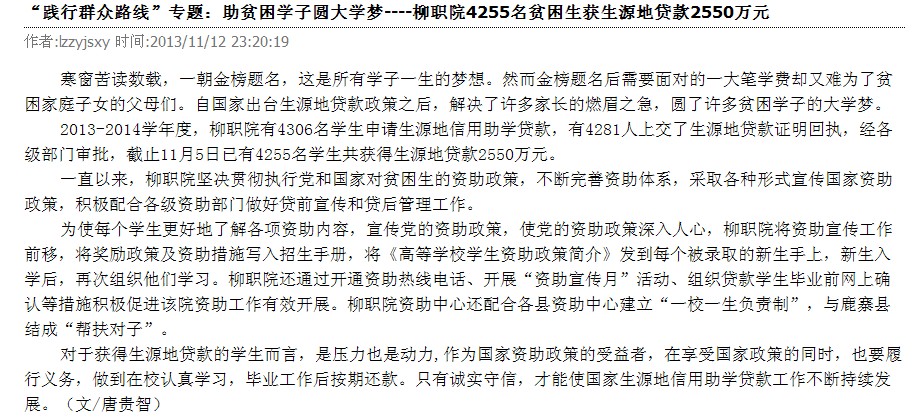2013年11月14日,柳州教育局网站发布我院做好贫困生贷款工作的信息。(崔智慧)