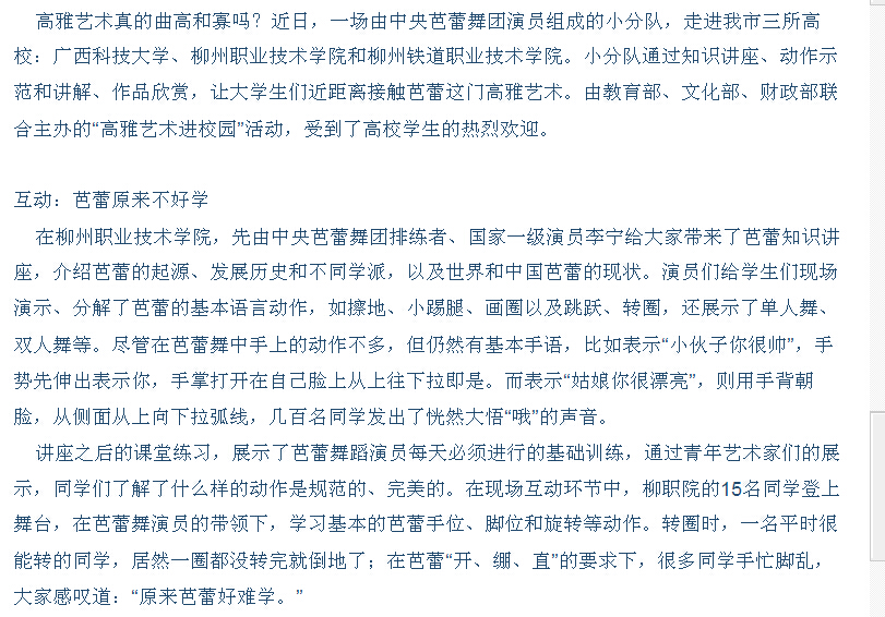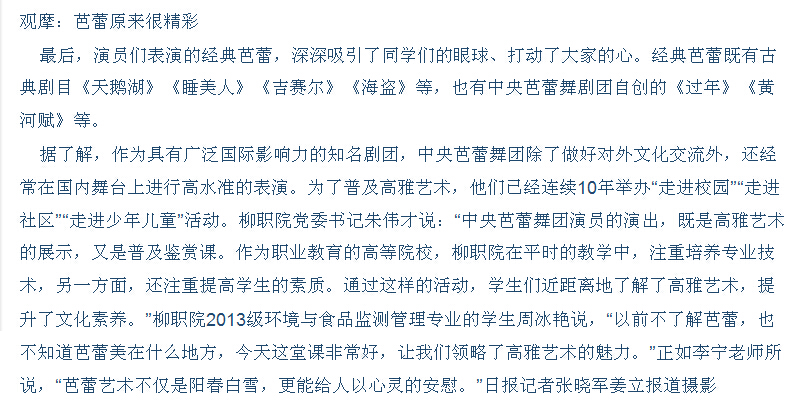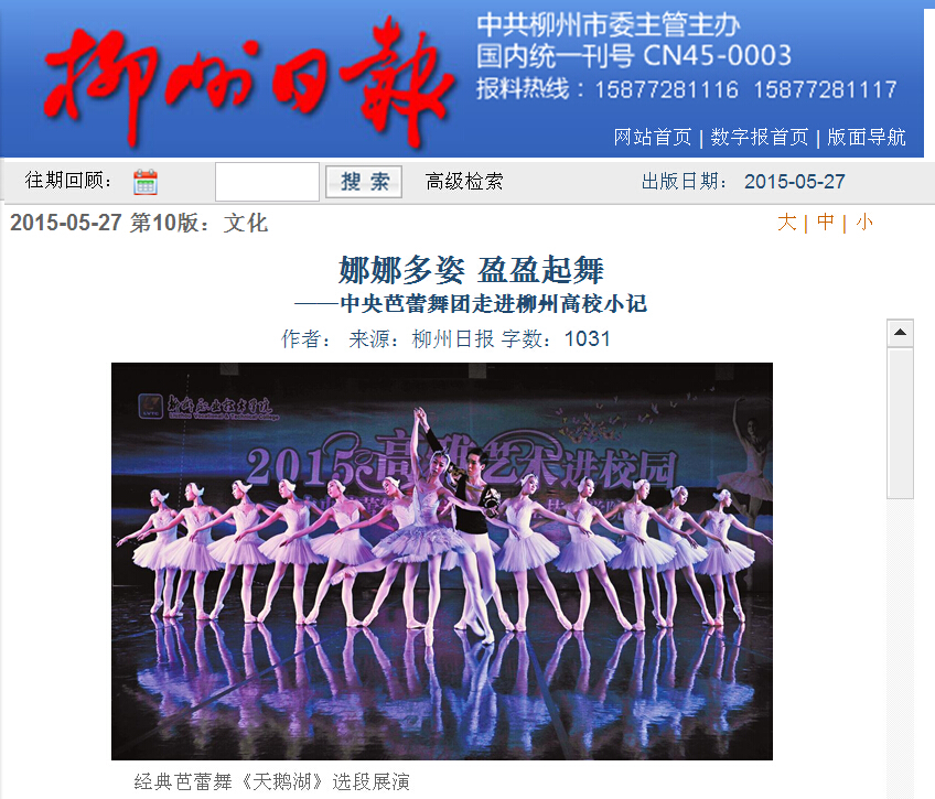 柳州日报近期刊发中央芭蕾舞团到我院演出的新闻 来源:柳州职业技术学院新闻网 作者:石玉丹 编审: 发布时间:2015-05-29 浏览次数: 次 【字体:小 大】 分享到: 2015年5月27日,柳州日报在第10版以“娜娜多姿,盈盈起舞”为题,刊发中央芭蕾舞团到我院演出的新闻。(截图:石玉丹) 关闭 打印正文