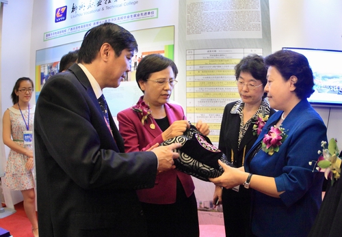 联展期间,国家教育部副部长鲁昕在自治区人民政府副主席李康及自治区教育厅厅长高枫的陪同下于9月21日上午亲临我院展厅参观指导。鲁昕副部长饶有兴致地参观了学院学生技能作品展示,详细了解了作品的功能和性能,对所取得的成果表示肯定。在欣赏我院学生技能作品展示之一----民族刺绣工艺手袋时,鲁昕副部长建议学院在作品上加入柳州职业技术学院的标志,可以作为教育部外事礼品选用。自治区副主席李康及自治区教育厅厅长高枫等领导对我院参展作品也给予了一致好评,对鲁昕副部长的建议高度赞同,肯定了我院的人才培养和实践创新工作。