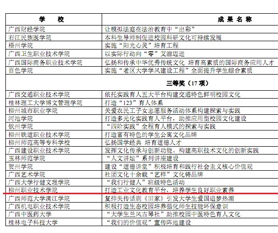 新闻网消息(通讯员 古志华)近日,自治党委宣传部、自治区高工委联合下发《关于公布2014年全区高校校园文化建设优秀成果评选结果的通知》(桂党高工宣[2014]42号),公布了2014年全区高校校园文化建设优秀成果评选结果,我院报送的《打造工业文化教育平台,培养学生良好职业素养》成果荣获三等奖。