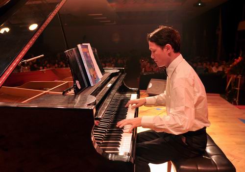 只见十指灵动,一段抒情轻快的旋律从他的指尖潺潺流出,如百灵鸟啼唱般欢快,如小泉叮咚般轻柔,学生们闭目聆听,陶醉在悦耳动听的音乐中。弹奏者正是音乐系覃红平老师,置身他的课堂,犹如身处音乐的殿堂,感染了无数年轻的心。