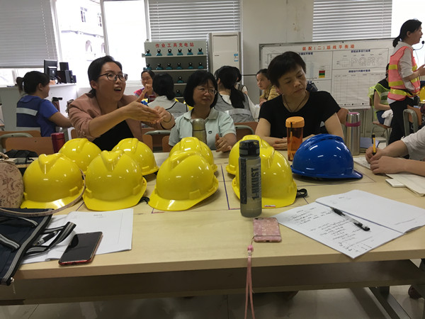熟悉工位操作后,工人们开始着工装、戴安全帽、戴袖套和手套。头发长的女工必须把头发扎起,塞到帽子里面去,以免在操作时被机器牵扯导致事故。所有这一切都是为了安全,在整个操作过程中,安全是第一位的。