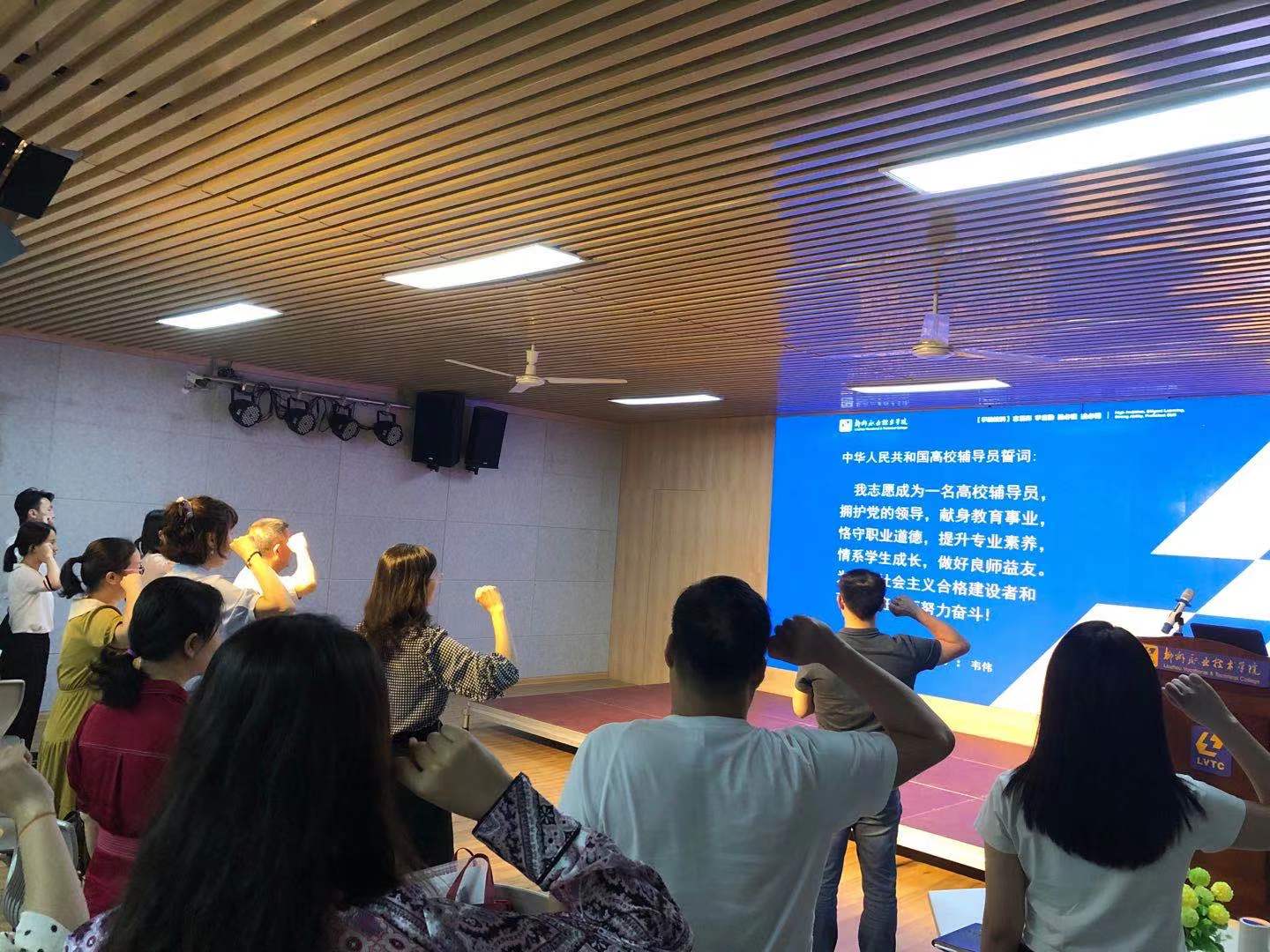 沙龙伊始,汽车工程学院辅导员韦雅琴带领在场嘉宾以齐奏“柳职辅导员交响曲”的形式进行开场破冰,活跃了现场气氛。随后全体辅导员重温辅导员誓词,坚定了辅导员们的理想信念与职业追求,领誓人为机电工程学院学生科科长韦伟。