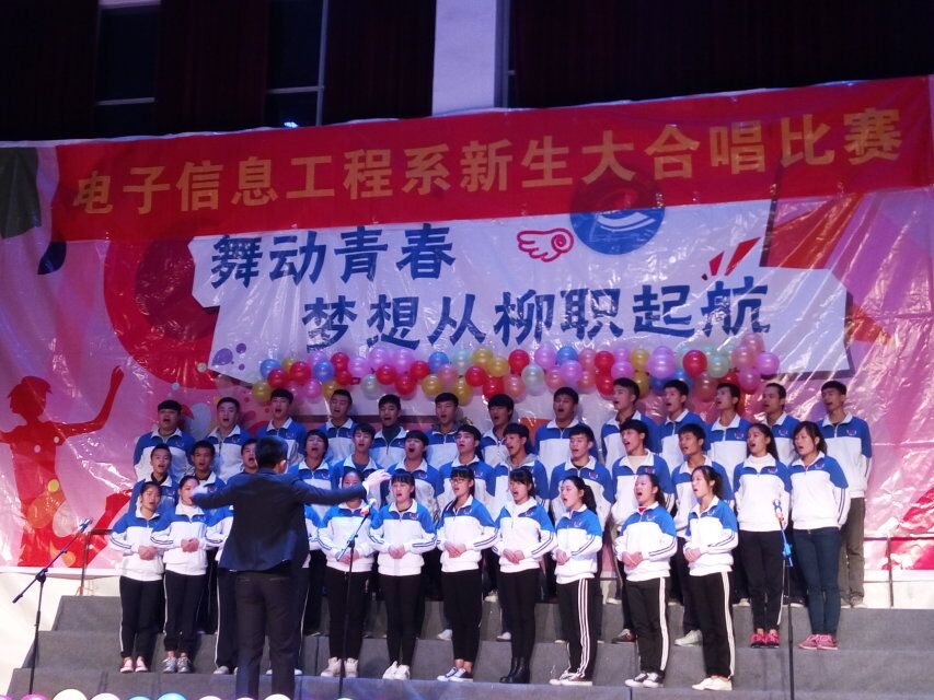 新闻网消息(通讯员/电信系 黄美伦)2015年12月24日晚19点30分,电子信息工程系在学院本部体育馆四楼举行2015-2016学年迎新大合唱比赛,活动邀请了该系党总支副书记黎晓灵、学生科长卢岚岚、分团委书记张晖宇、任课教师李瑞娟、学生辅导员李丽、龙思珍、刘根婷、莫东平等出席本次活动,比赛由电信系分团委学生会副主席刘柳辉、秘书长杨建林、环食系学生会副主席陶成丽、 财务系学生会主席郑甫、汽车系学生会主席莫振鸿担当评委;戚冰冰、罗俊豪、苏宁主持比赛。