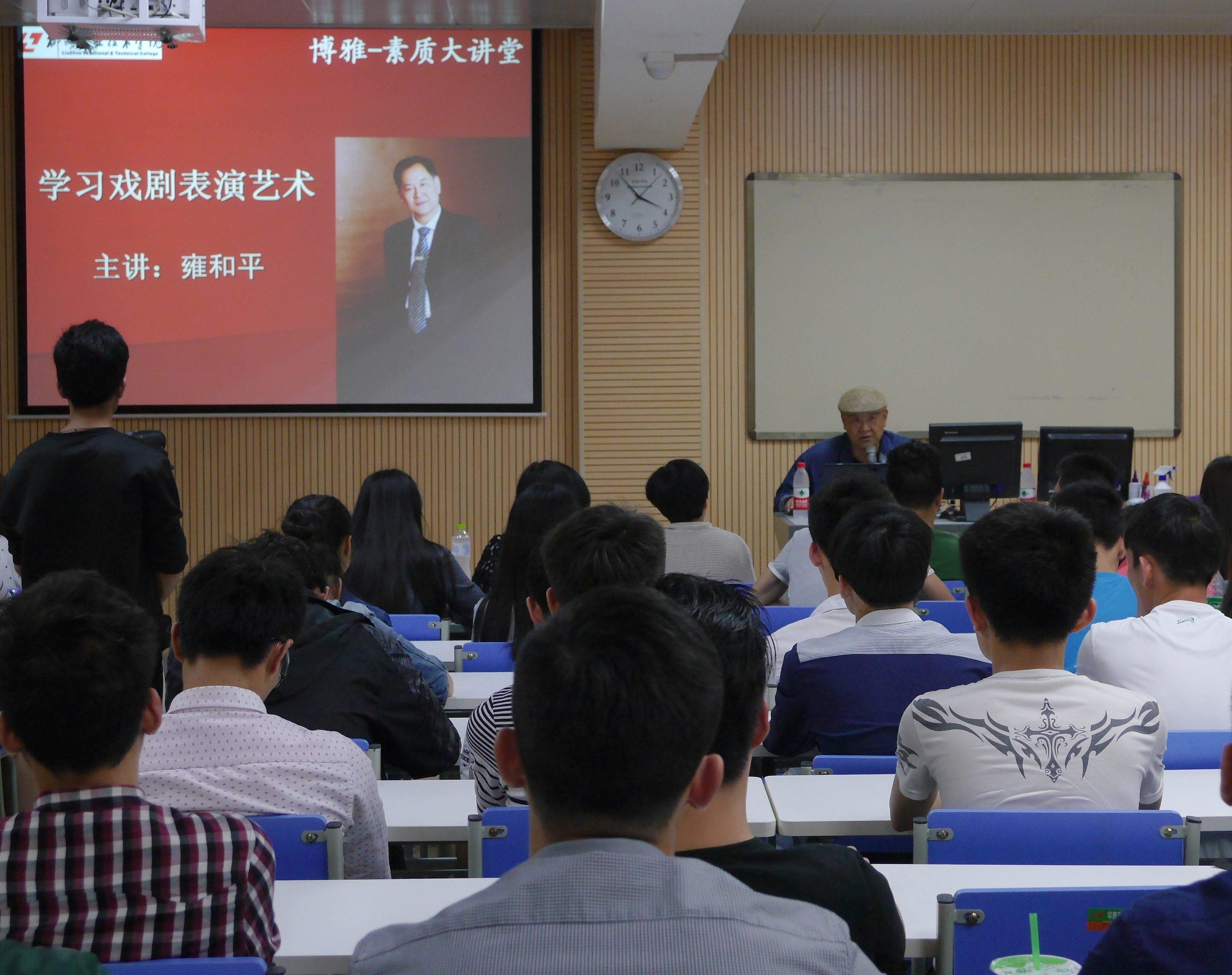 曾在30多部影视剧中饰演过不同角色的雍和平老师,是山西省太原市话剧团演员、台词指导、配音导演、演员 ,以及广播小说演播家、柳州语言表演学会艺术指导,也是我校艺术系表演课的客座教授。雍和平老师有着丰富的话剧表演经验,并在许多颇有影响力的优秀影视作品中有过精彩的演绎。讲座中,他结合自己深厚的话剧表演功底和多年的话剧舞蹈表演经验,深入浅出地和同学们介绍了什么是话剧、话剧的基本内容,以及学习戏剧表演对大学生有什么提高等知识。讲座进行了两个小时,同学们从这位已经退休的老艺术家身上,看到了那一份对表演艺术执着的热爱。讲座结束后,他还和现场话剧队同学亲密互动,传授了一些舞台表演技巧和舞台突发事故处理方法。