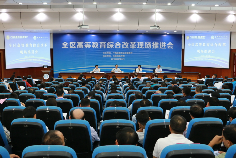 新闻网消息(文、图/教务处 黎华) 2017年10月13日,由广西壮族自治区高校工委、教育厅主办的全区高等教育综合改革现场推进会在玉林师范学院隆重召开。自治区高校工委书记、教育厅厅长莫诗浦,教育厅副厅长白志繁、玉林市副市长吕剑枫、全区78所高校的157名学校领导和业务负责人出席会议。会议交流综合改革经验、共同谋划广西高等教育的未来。
