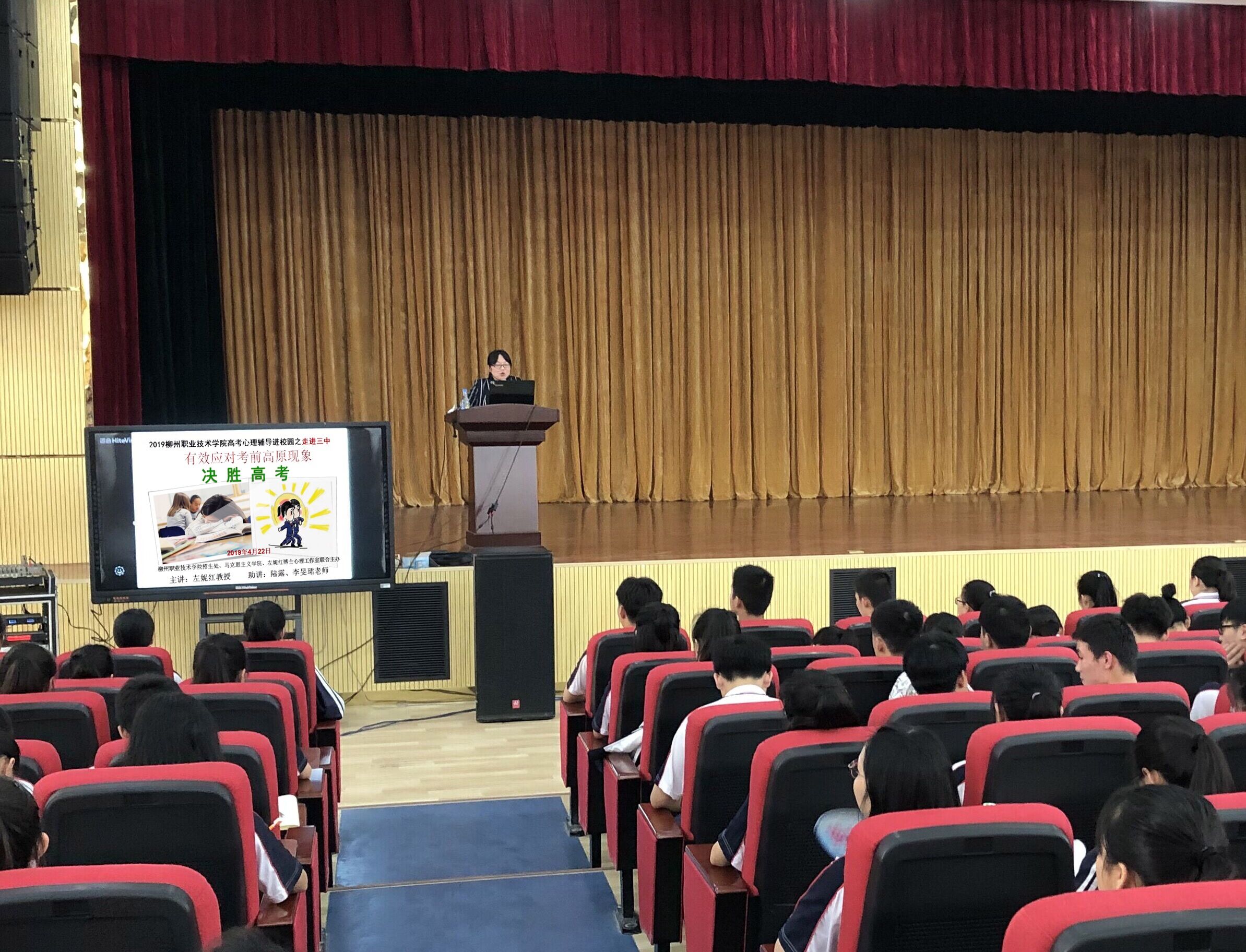 (文、图/马克思主义学院 李旻珺 )2019年4月23日,应柳州市第三中学的邀请“2019年柳州职业技术学院高考心理辅导进校园活动”走进该校,左妮红教授、博士为市三中600余名高三学子主讲了题为《有效应对考前高原现象决胜高考》高考心理辅导讲座,讲师团队成员还包括招生处的陆露老师和马克思主义学院的李旻珺老师。
