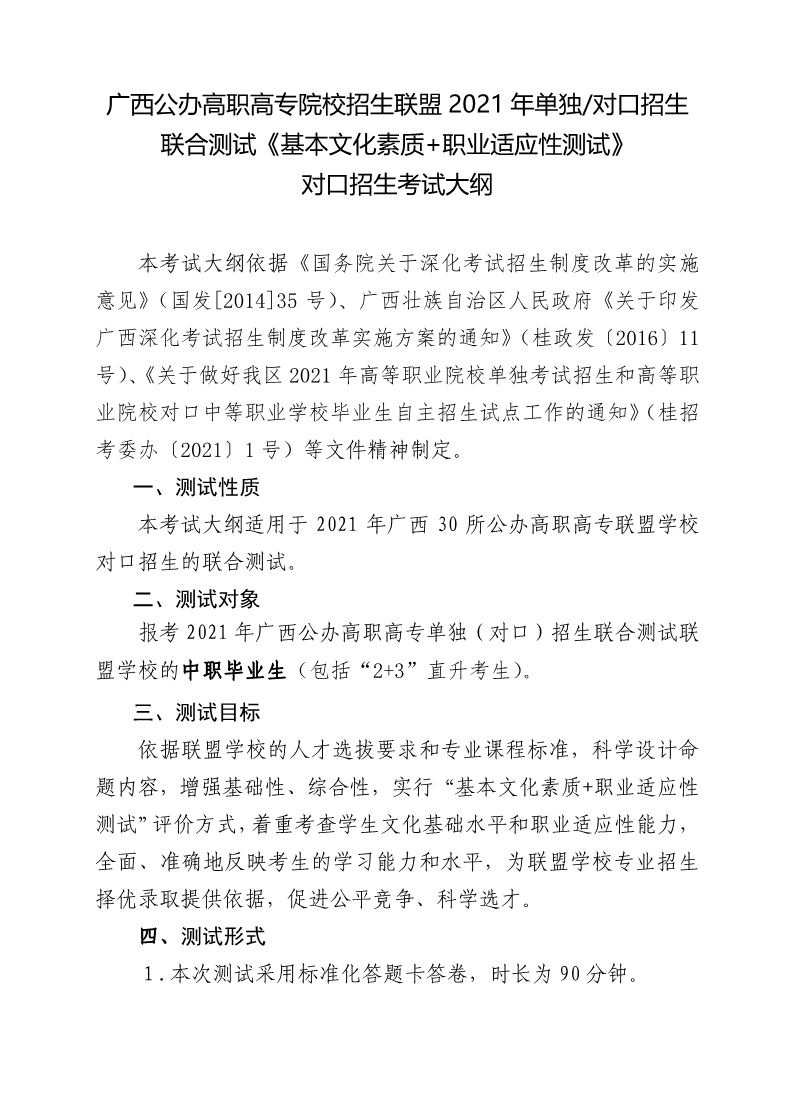广西公办高职高专院校招生联盟2021年对口招生联合测试考试大纲及样题 来源:广西公办高职高专院校招生联盟 发布时间:2021-03-04 17:50:41 浏览次数: 次 【字体:小 大】 终审:招生信息中心 分享到: 【打印正文】