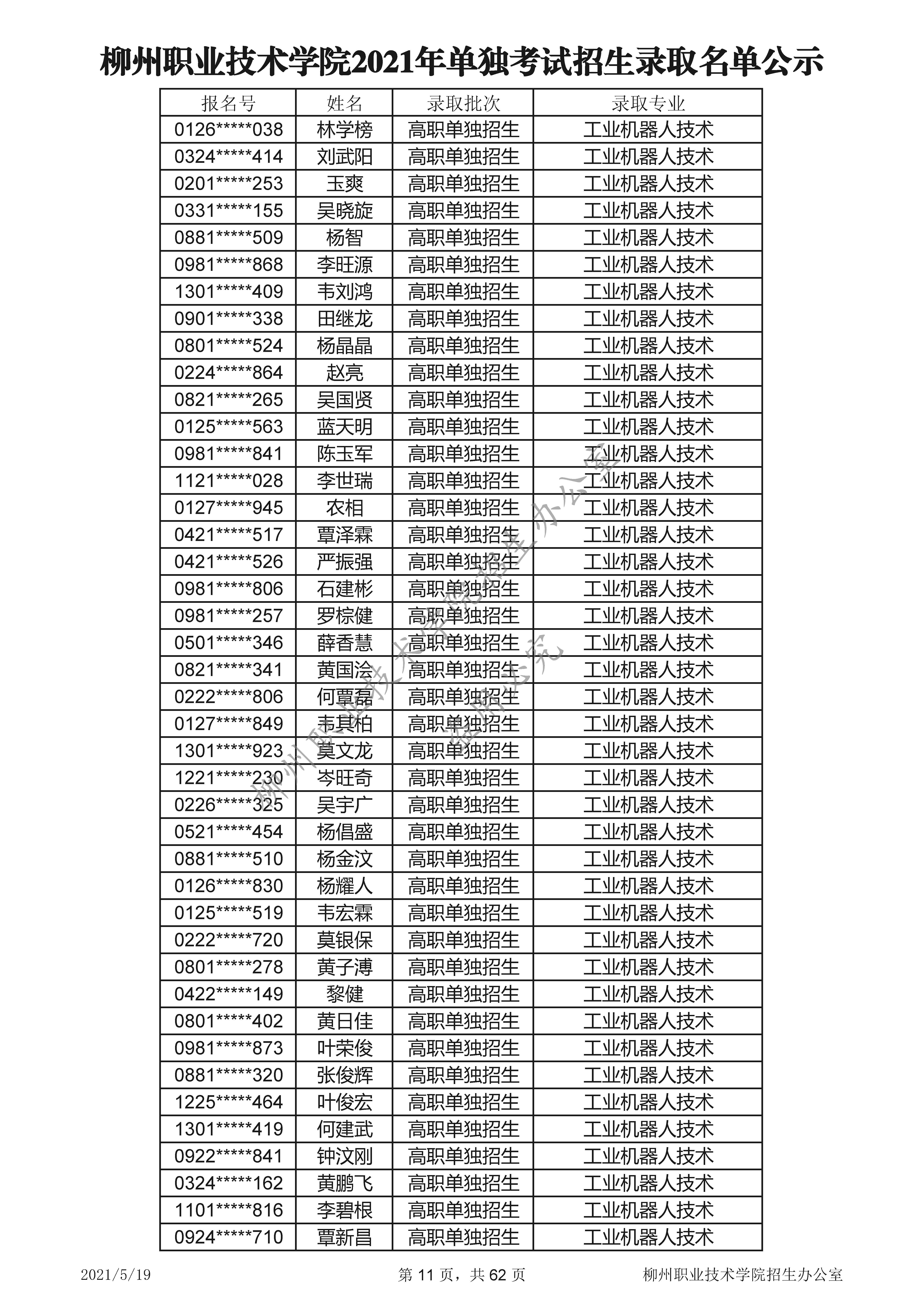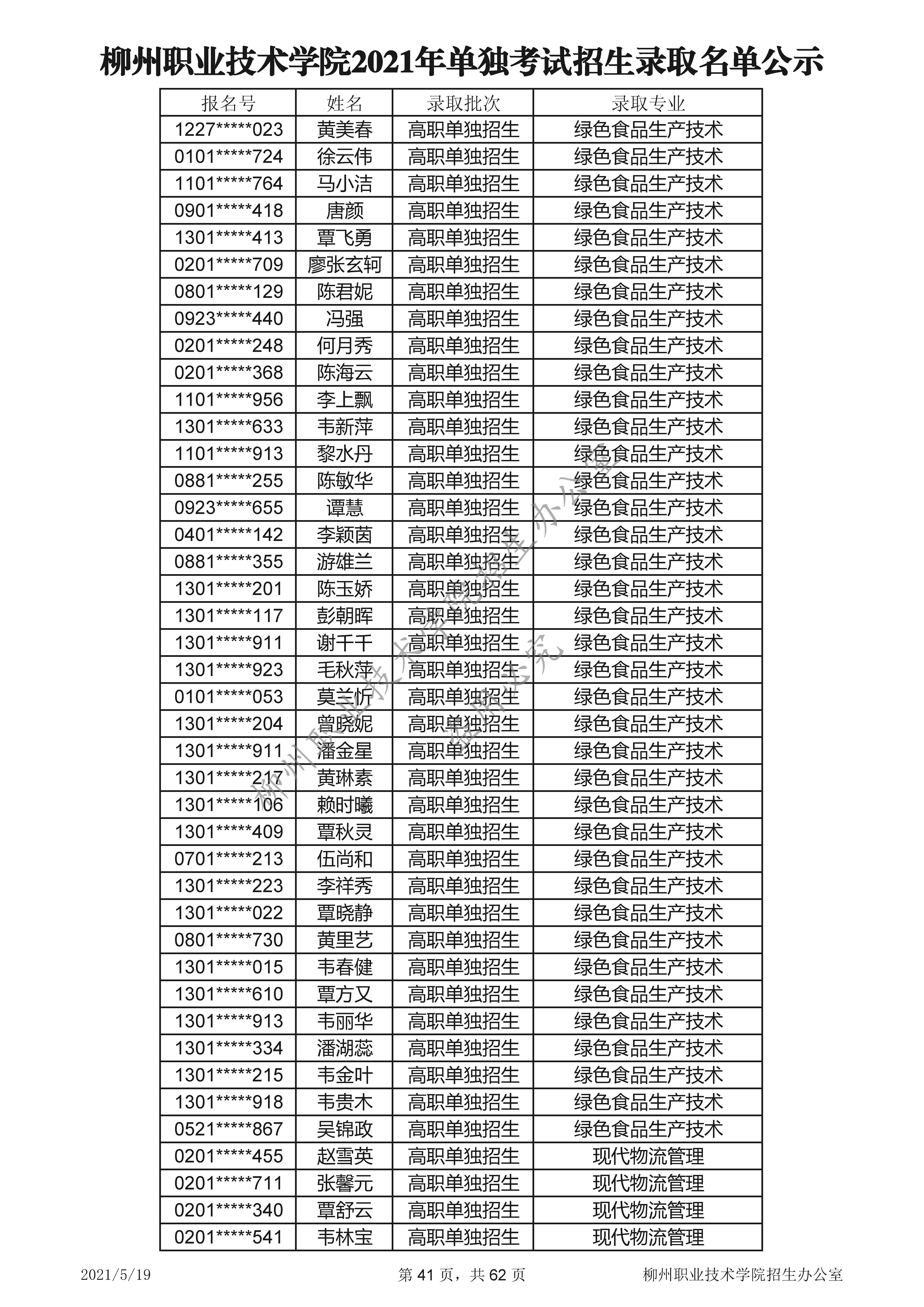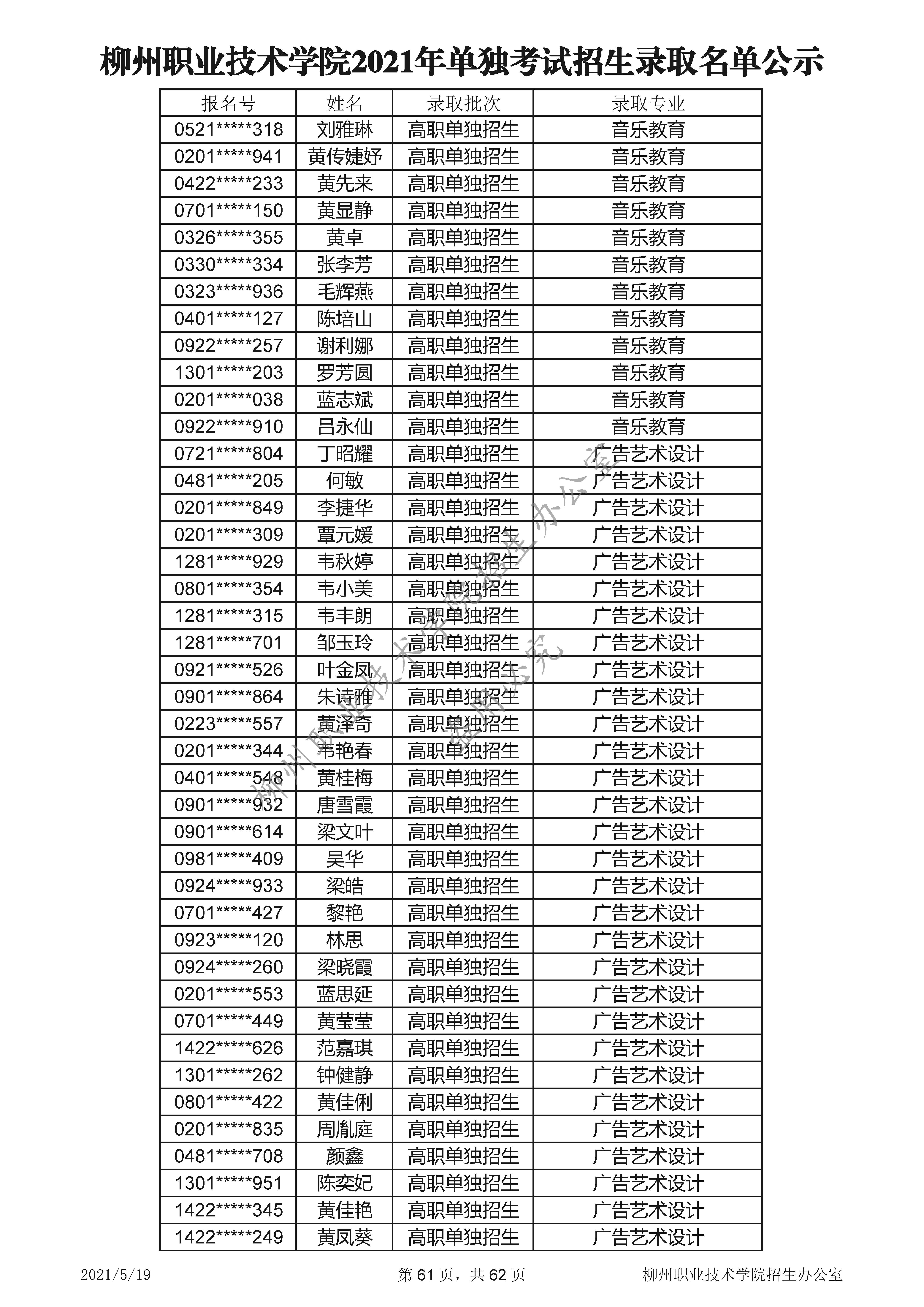 根据《关于做好我区2021年高等职业院校单独考试招生和高等职业院校对口中等职业学校毕业生自主招生试点工作的通知》(桂招考委办〔2021〕1号)等文件要求,按照广西招生考试院统一安排,我校2021年单独考试招生录取工作已经结束,招生计划已经录满,录取名单已通过广西招生考试院审核。按照我校《柳州职业技术学院2021年招生章程》(柳职院字〔2021〕31号)的规定,现对我校单独考试招生录取名单予以公示(名单附后)。