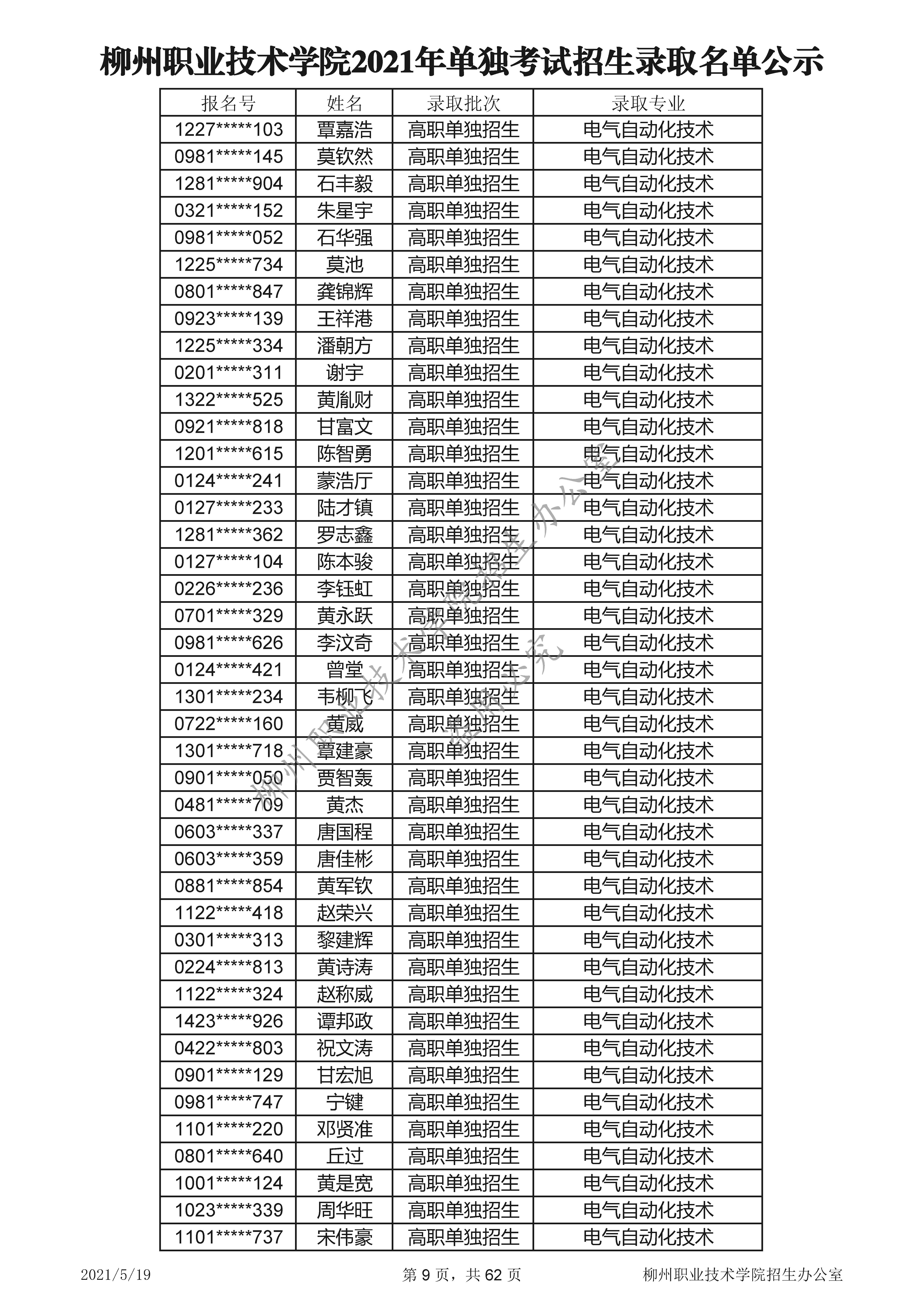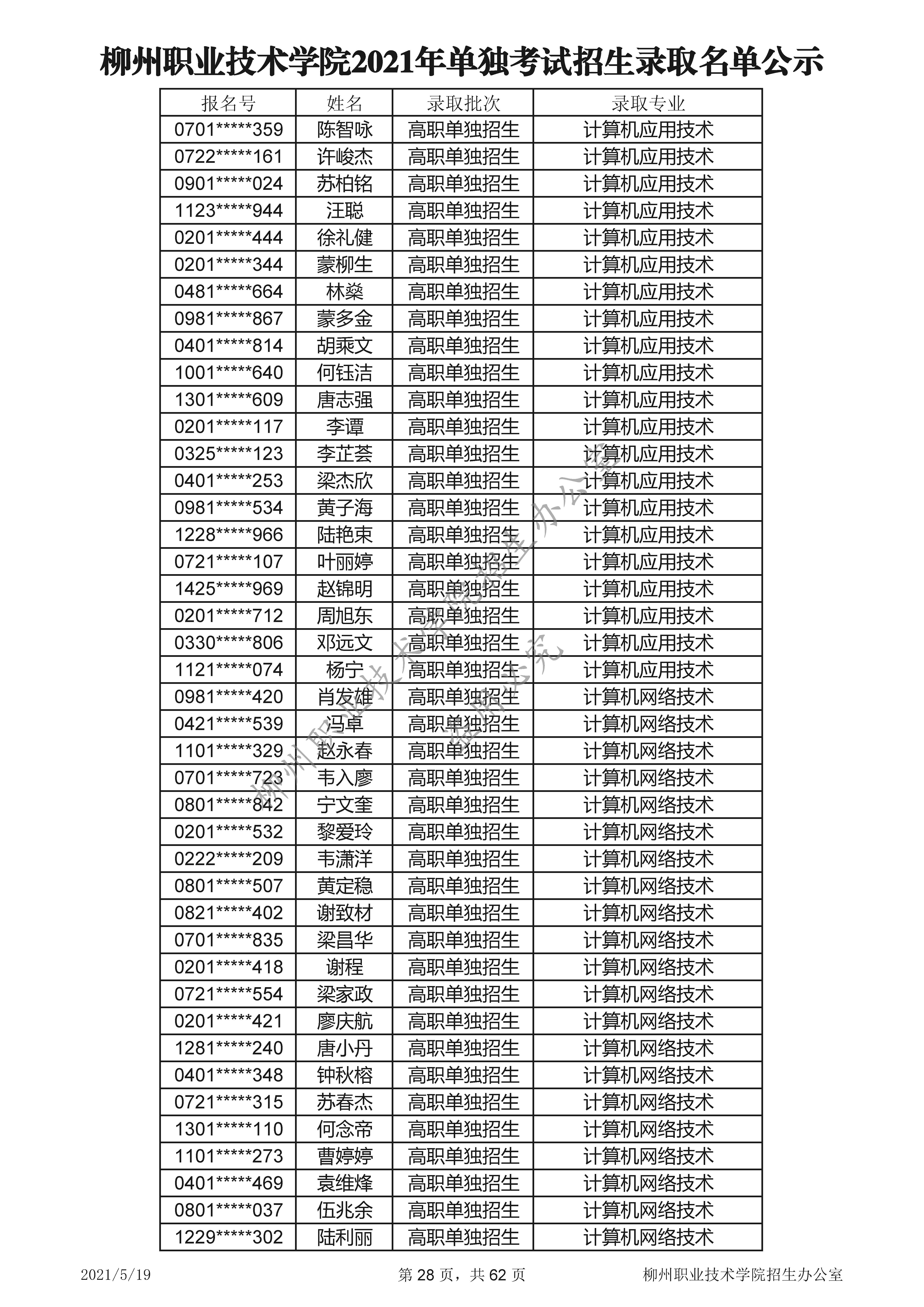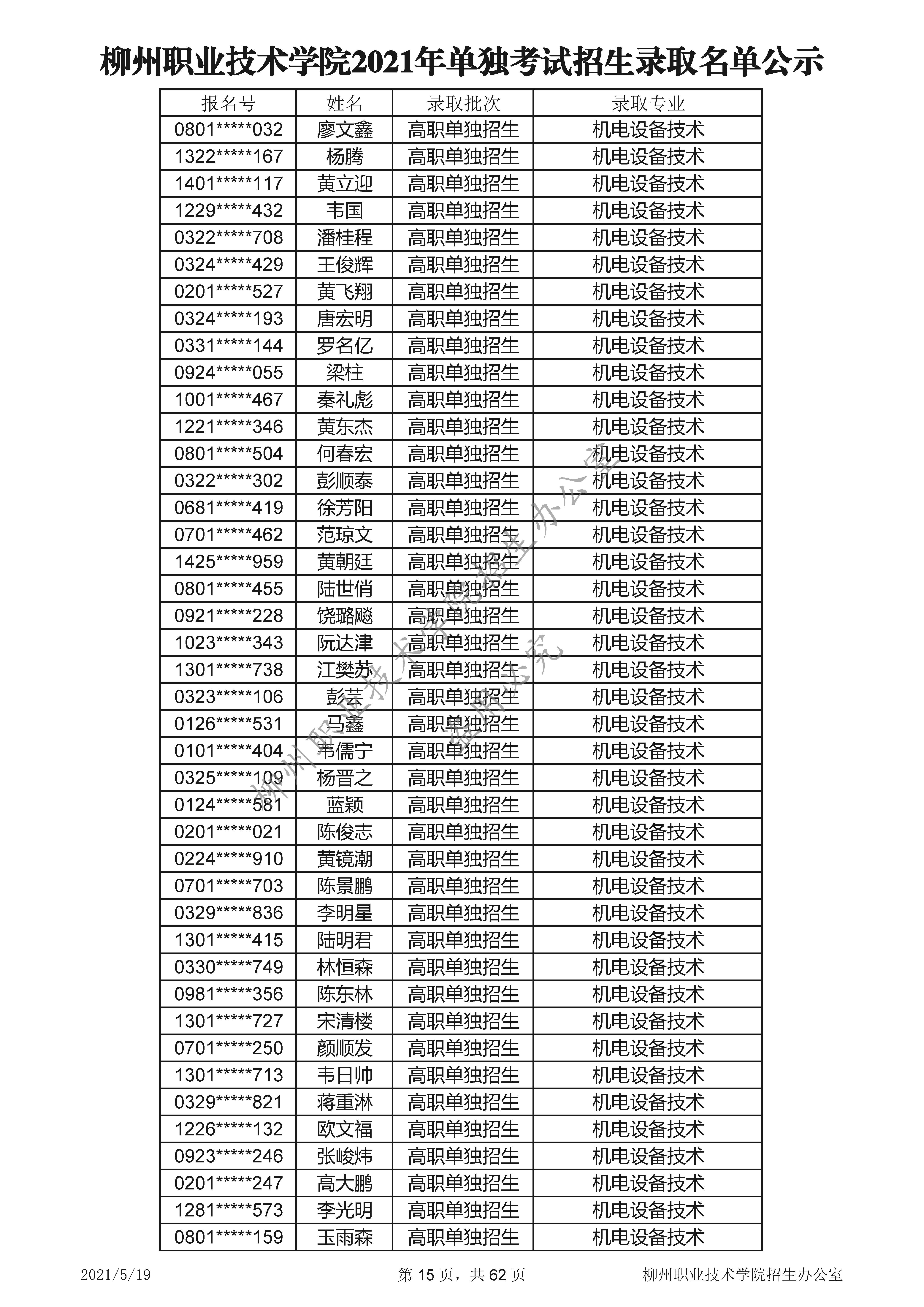 根据《关于做好我区2021年高等职业院校单独考试招生和高等职业院校对口中等职业学校毕业生自主招生试点工作的通知》(桂招考委办〔2021〕1号)等文件要求,按照广西招生考试院统一安排,我校2021年单独考试招生录取工作已经结束,招生计划已经录满,录取名单已通过广西招生考试院审核。按照我校《柳州职业技术学院2021年招生章程》(柳职院字〔2021〕31号)的规定,现对我校单独考试招生录取名单予以公示(名单附后)。
