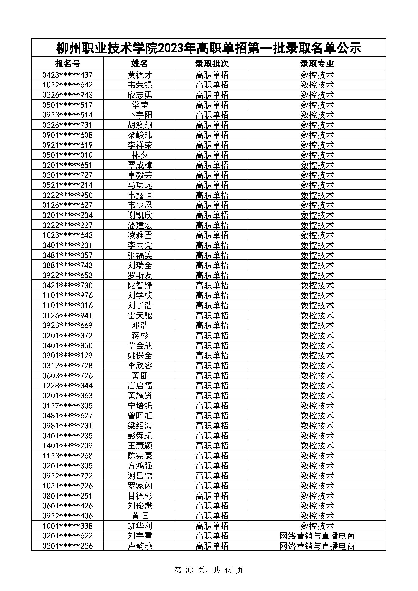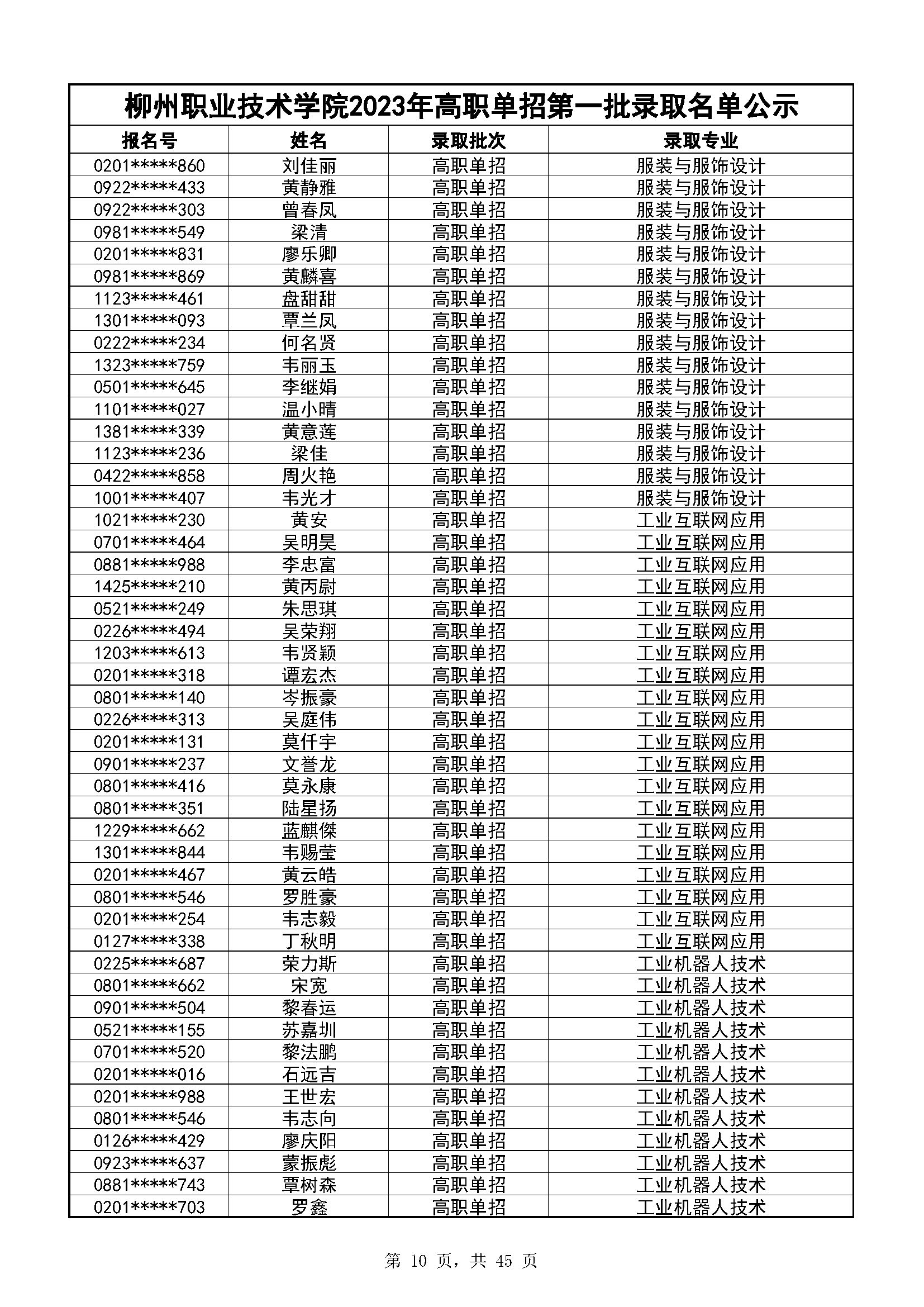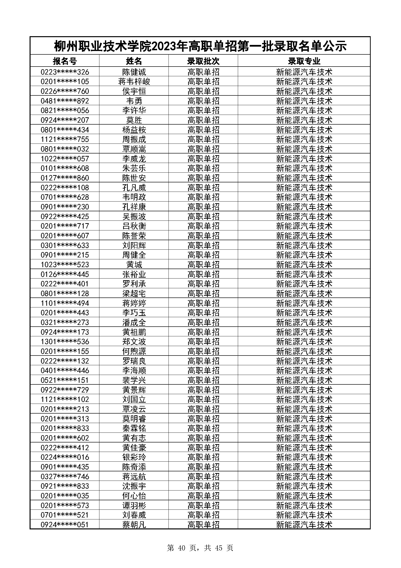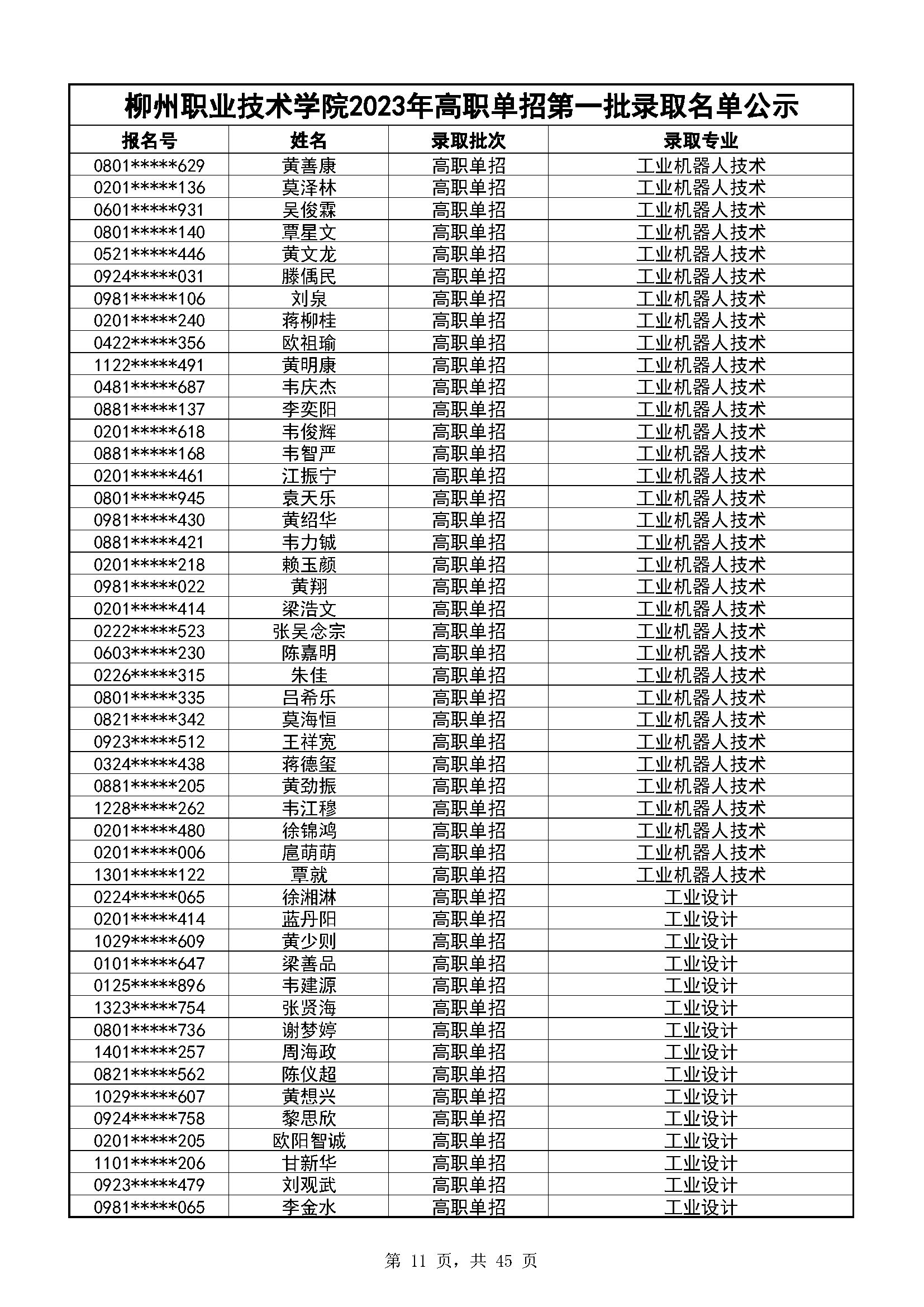 柳州职业技术学院2023年高职单招录取名单公示(第一阶段)
