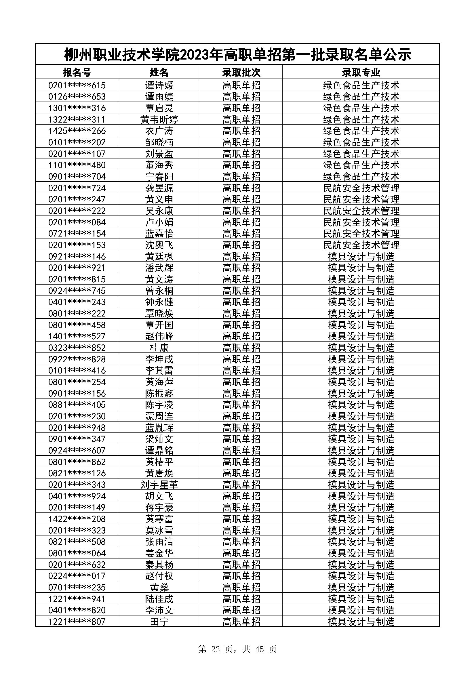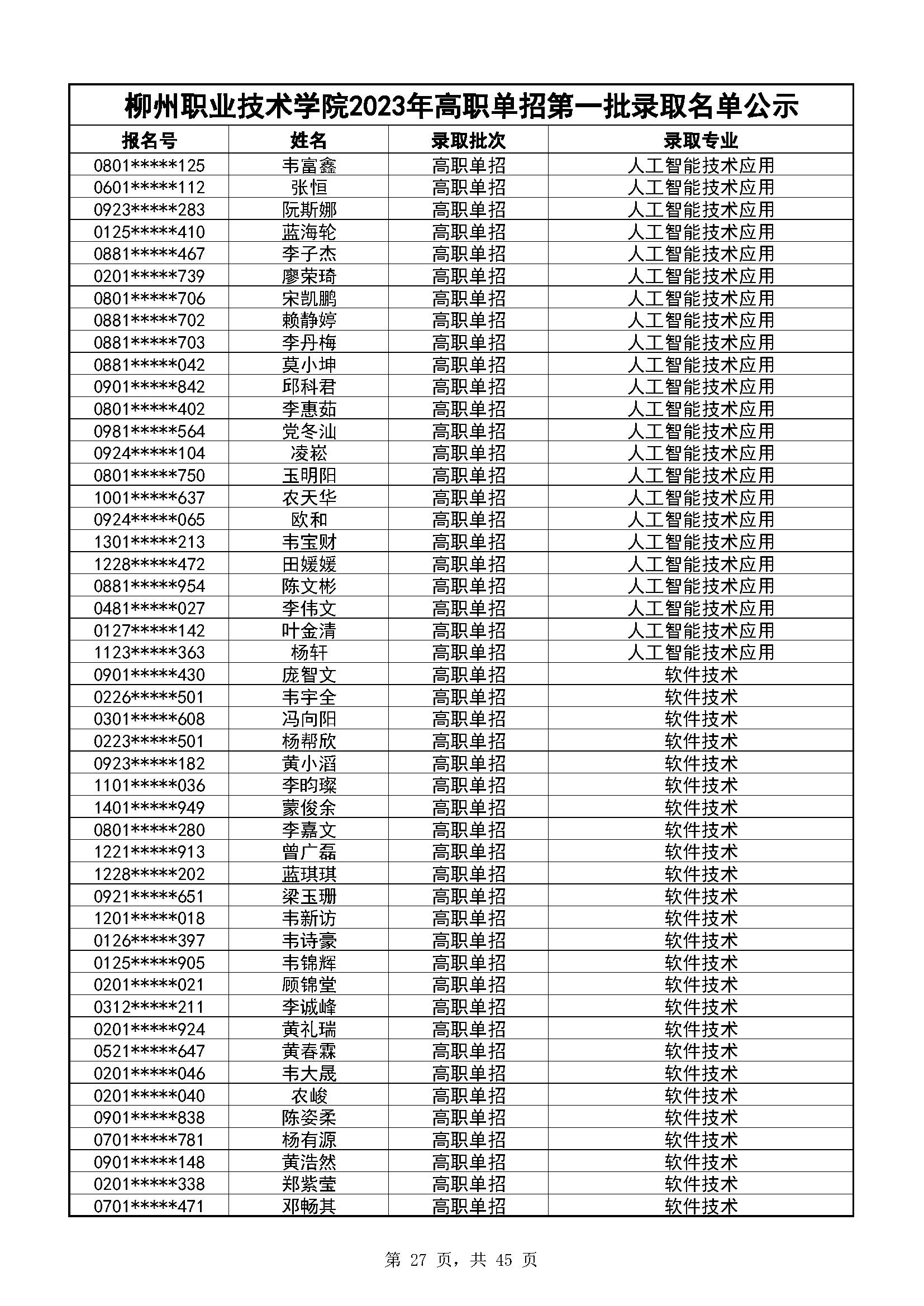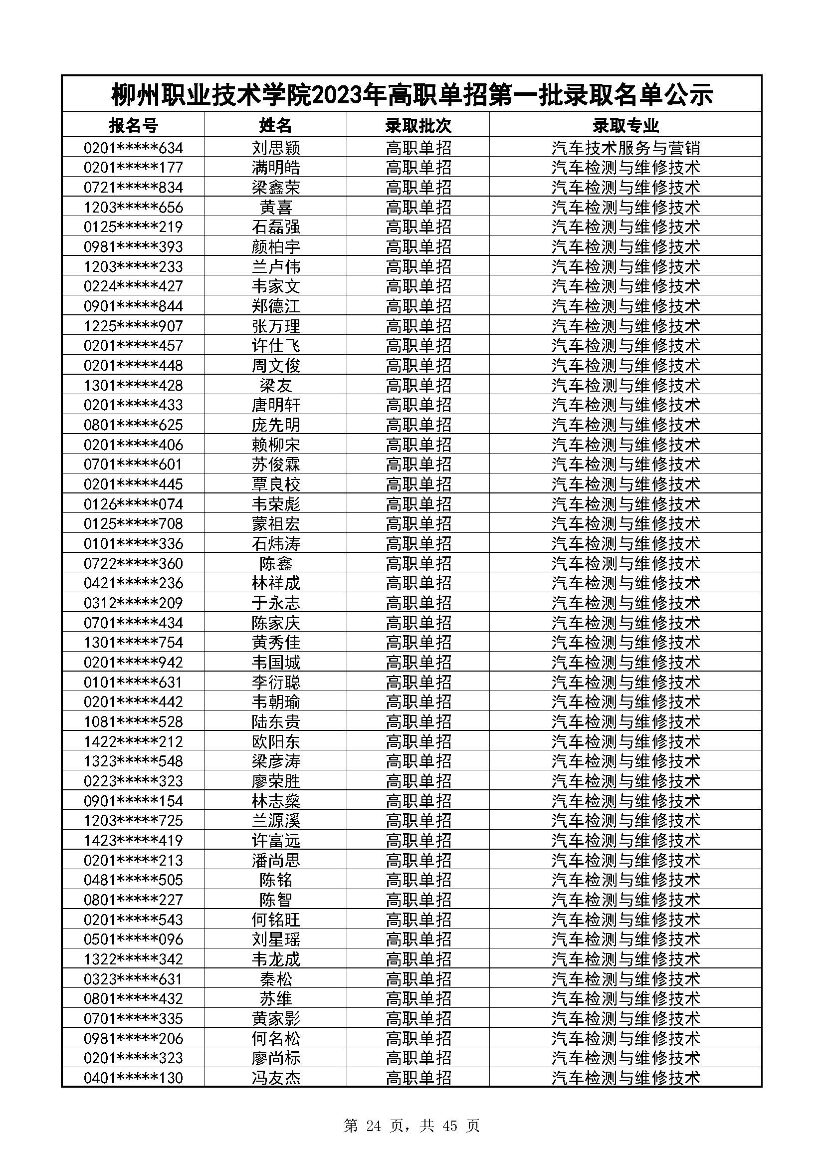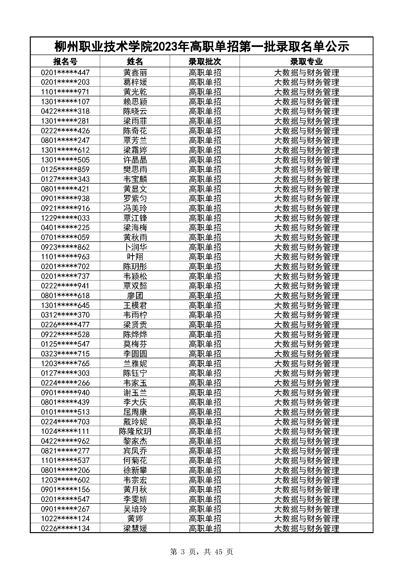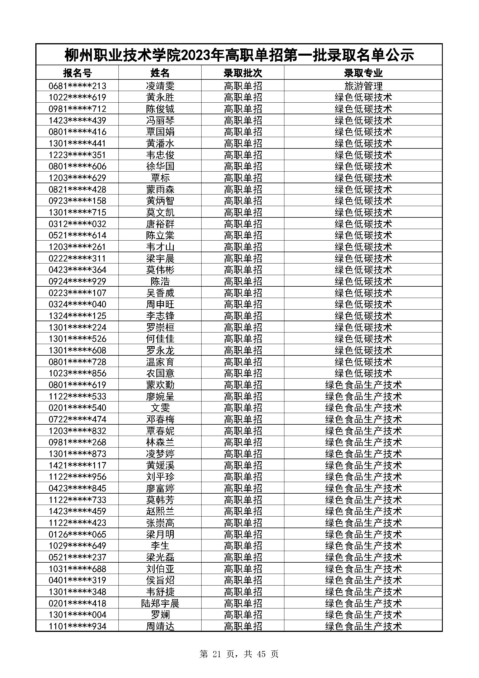 柳州职业技术学院2023年高职单招录取名单公示(第一阶段)