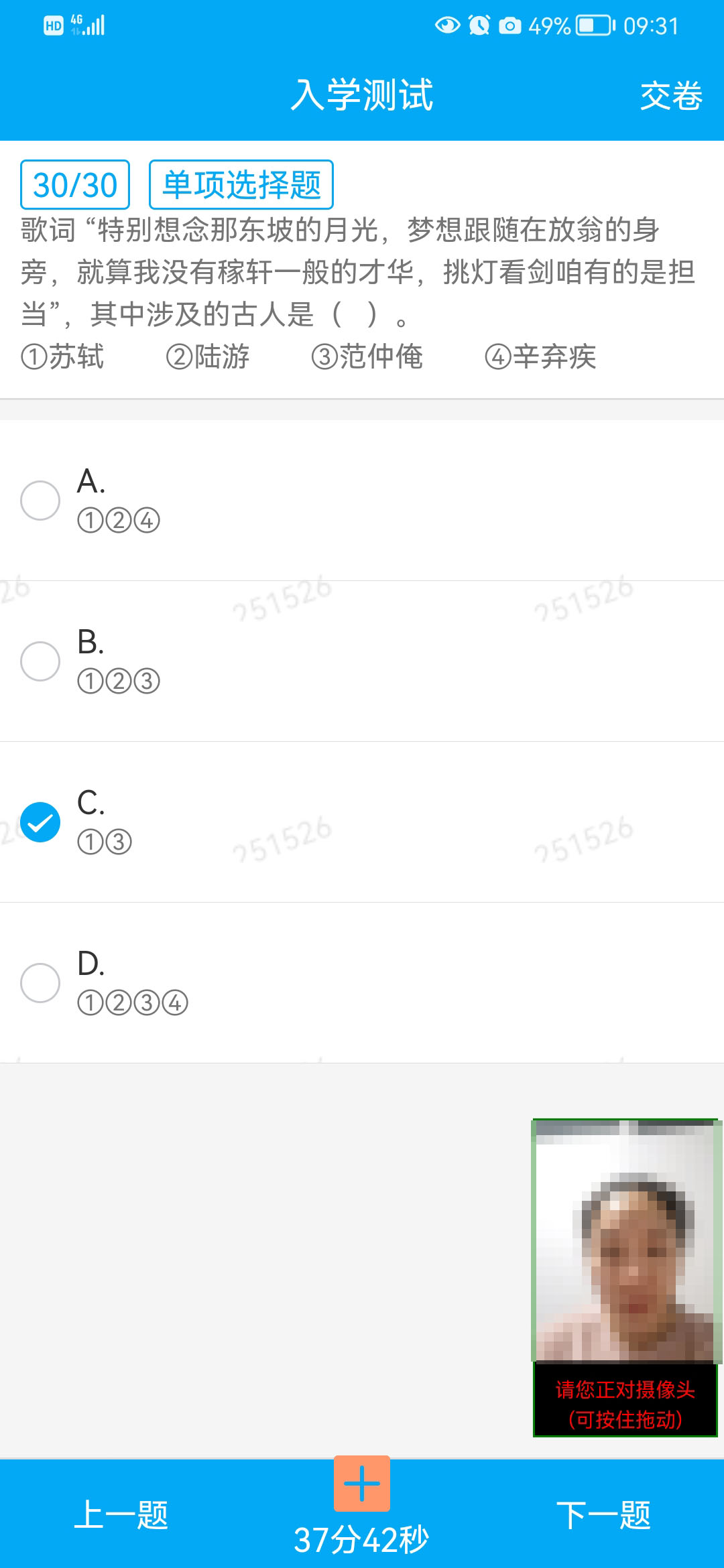 4.作答界面分为题干区与作答区两部分,答题过程中要求考生全程保证自己的人脸直接对准手机的前置摄像头。操作说明: