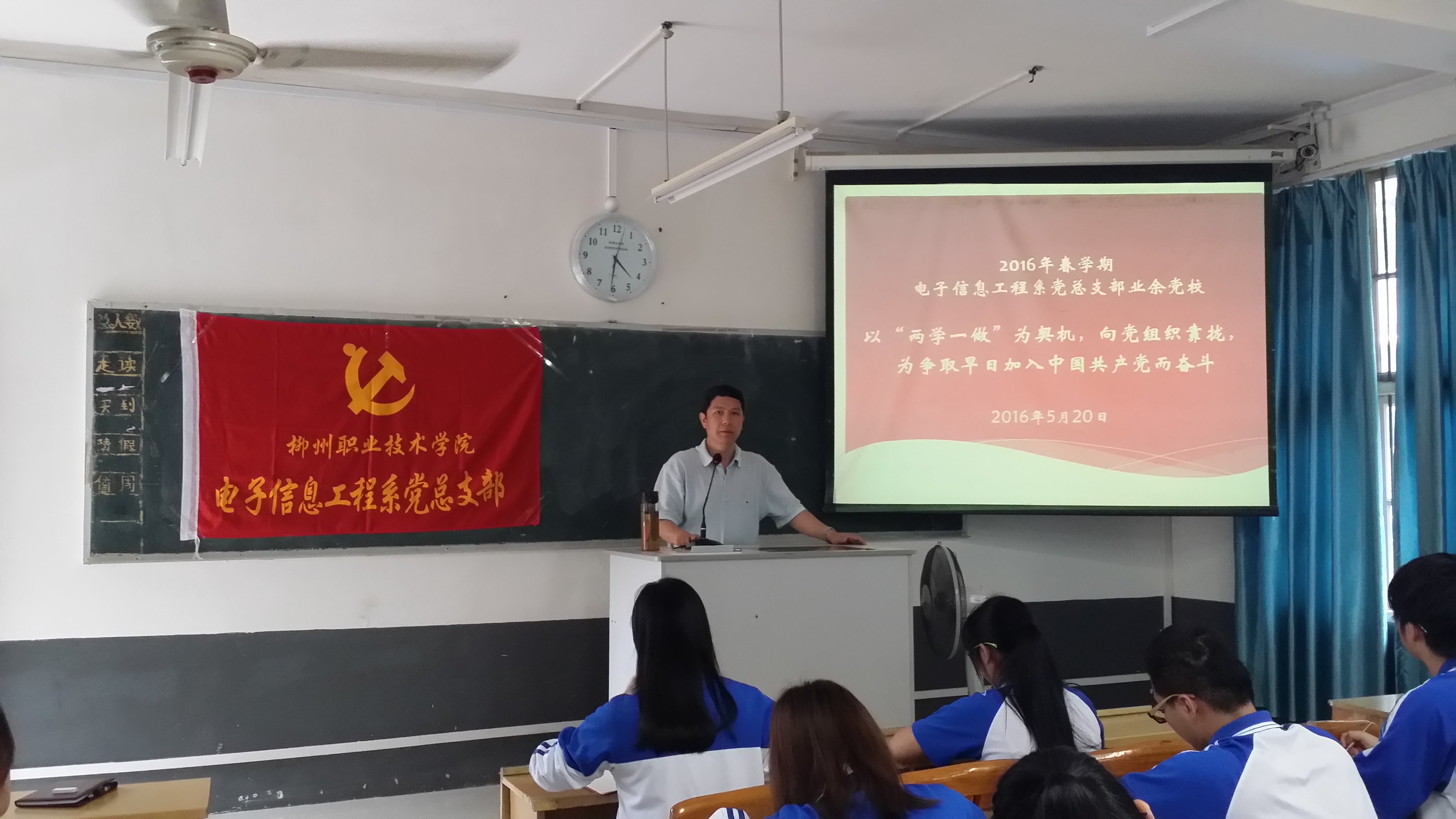 新闻网消息(通讯员/电信系 董小慧、梁荣姣 图/龙思珍)5月20日下午,电子信息工程系党总支部在文华楼201教室,举行了以“两学一做”为契机,向党组织靠拢,为争取早日加入中国共产党而奋斗”为题的讲座。主讲人是党总支副书记黎晓灵,学生党支部的学生党员、拟在近期发展的优秀入党积极分子聆听了讲座。