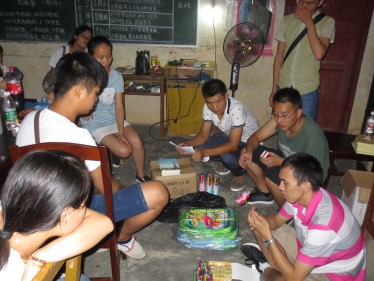 志愿服务队利用夜间开会总结工作,准备支教用品