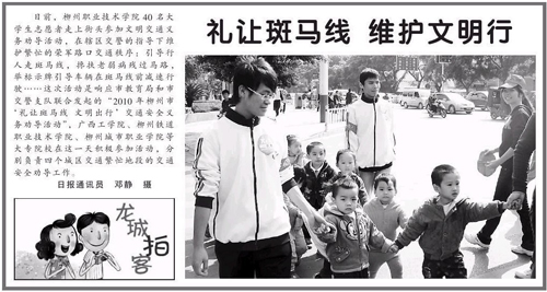 2010年11月3日,《柳州日报》以图文并茂的形式报道了我院艺术设计系青年志愿者到荣军路口开展“礼让斑马线,礼让行车”交通安全义务劝导活动。