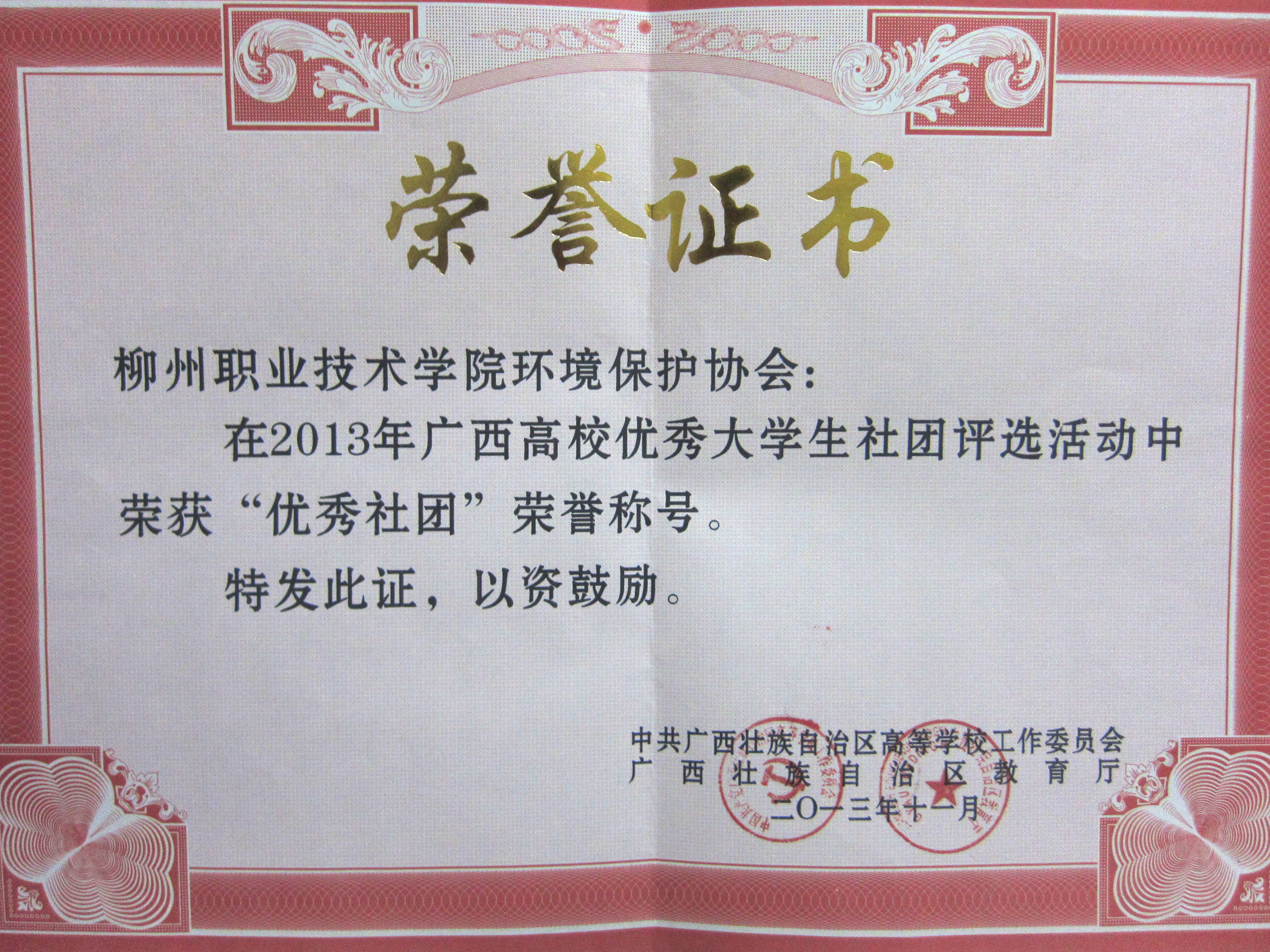 我院环境保护协会荣获“2013年广西高校优秀大学生社团”荣誉称号