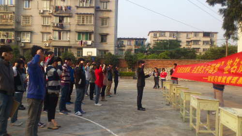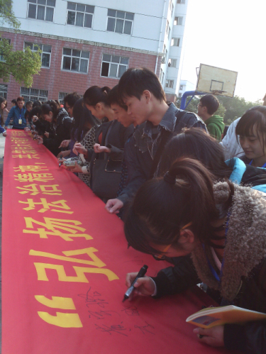 接着,同学们到操场进行了以“弘扬法治精神,共筑伟大中国梦”为主题的签名活动。大家一起宣誓,要恪守职业道德,维护法律的尊严,为建设社会主义法治国家奉献自己的力量。(文/柳麟锋、杨丽丽 图/陈春梅)