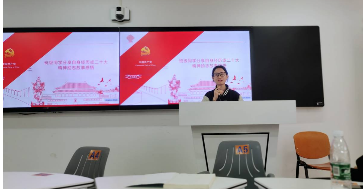 会议伊始,同学依次分享学习贯彻党的二十大精神的心得体会,交流氛围热烈。随后范海静对同学们的分享交流给予肯定,并针对大家在学习中遇到的问题予以答疑。她说到,作为青年大学生要自觉将“小我”成长融入“大我”奋斗之中,把个人的理想追求融入党和国家事业之中,为实现中华民族伟大复兴的中国梦作出贡献。要仔细研读党的二十大报告,学党史,知党恩,跟党走。作为新时代青年要树立远大理想目标,肩负重任,为全面建成社会主义现代化强国而奋斗。接着班级开展了“听红歌识曲”及“红歌大合唱”活动,同学们踊跃抢答,现场气氛高涨,趣味性十足。