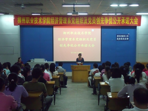为充分发挥基层党组织的战斗堡垒作用和共产党员的先锋模范作用,进一步巩固创先争优活动取得的成效,2010年10月20日,经济管理系党总支部在思贤楼101教室召开党组织及党员创先争优公开承诺大会。学院党委副书记兼经济管理系创先争优联络点负责人阳旭、学院组织部部长黎凤环、宣传部副部长蓝星华、公共基础部党总支书记姜献生、共建单位鱼峰区五里亭办事处莫芬芳副主任、鱼峰区五里亭办事处蝴蝶山社区党总支书记张秋红、鱼峰区五里亭蝴蝶山社区主任覃谦、经济管理系全体教师党员、全体学生党员、民主党派代表、部分党外群众代表共220人参加了大会。会议由经济管理系党总支部宣传委员王静老师主持。
