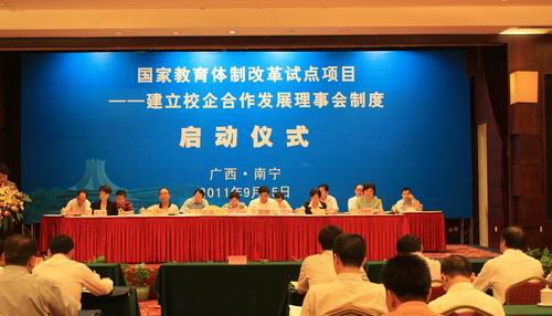 2011年9月25日上午,广西壮族自治区的国家体制改革试点项目——建立校企合作发展理事会制度的启动仪式在南宁举行。自治区人民政府副主席李康,教育厅厅长高枫、副厅长杨伟嘉,有关厅局及市政府、15所高职院校负责人、有关行业企业代表出席此次活动。