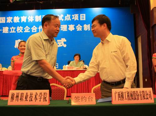 我院领导石令明院长、林若森副院长出席了启动仪式。与我院建立了长期紧密合作的广西柳州工程机械股份有限公司人力资源总监吴荫登作为我院校企合作的企业代表一同出席了启动仪式。启动仪式上,我院与广西柳州工程机械股份有限公司签订了协议,双方进一步加强全方位合作,建立校企合作联盟。