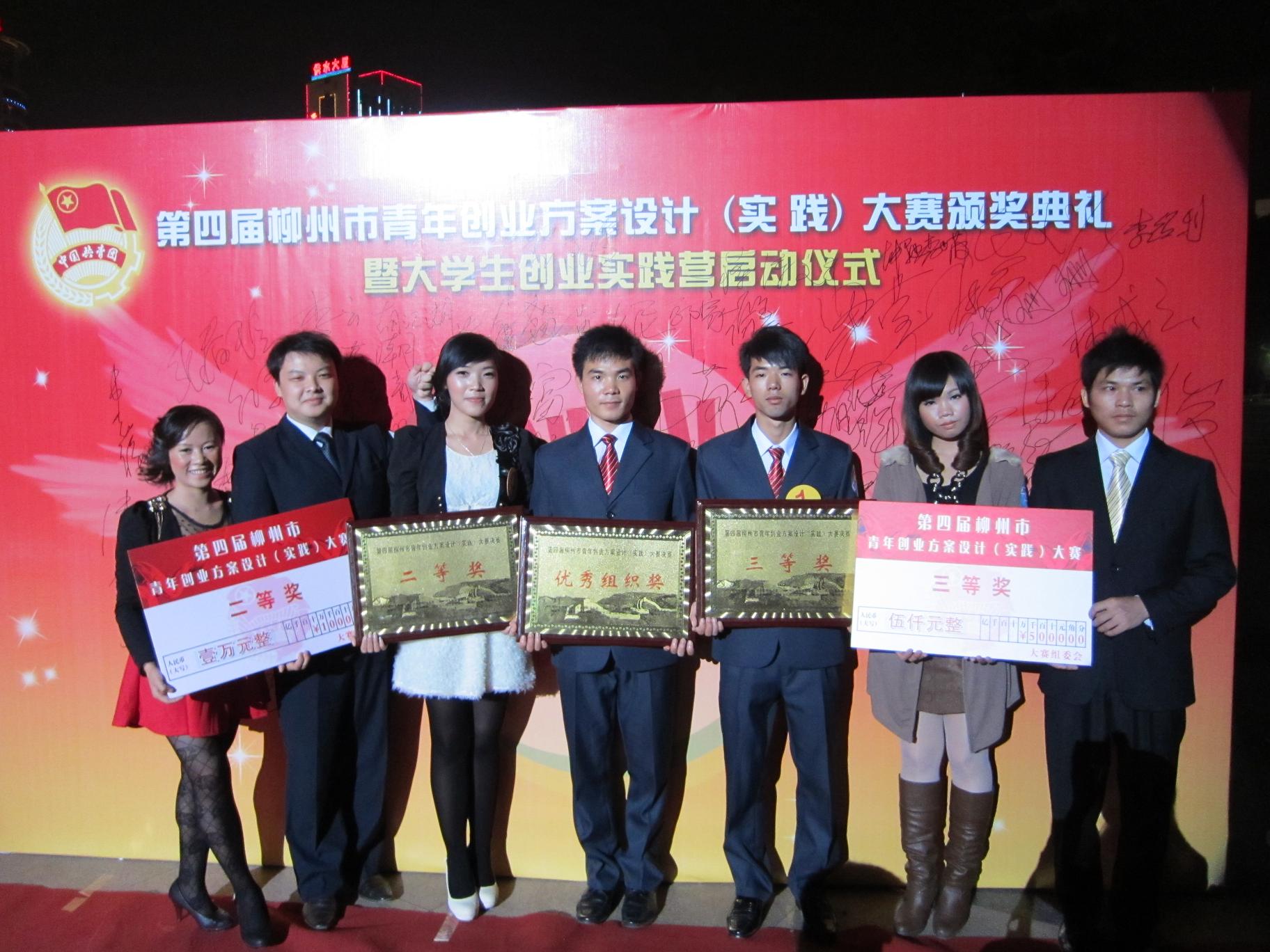2011年11月29日晚,第四届柳州市青年创业方案设计大赛颁奖典礼暨实践营启动仪式于市人民广场举行。由市委宣传部、团市委、市工信委、市商务委、市人社局、市工商局、柳州日报社和柳州银行共8家单位联合主办的本次大赛,历时半年最终落下帷幕。我院2支参赛队伍经过激烈角逐,突破重重考验实力尽现,郑书怀、郭家雄等5位同学负责的 “广西清馨竹资源综合开发项目”荣获大赛二等奖,骆远海等3位同学负责的“移动洗车项目”荣获大赛三等奖,我院团委荣获本届大赛优秀组织奖。