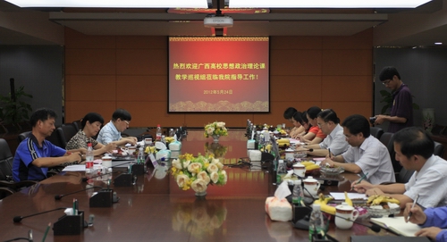 为深入贯彻《中共中央宣传部 教育部关于进一步加强高等学校思想政治理论课教师队伍建设的意见》和《关于进一步加强广西高校思想政治理论课教师队伍建设的实施意见》等文件精神,切实加强对全区高校思想政治理论课教育教学工作的检查和指导,2012年5月24日上午,由广西师范大学漓江学院林凤鸣教授、原桂林工学院党委副书记李善辉教授、桂林旅游高等专科学校周伟光教授组成的广西高校思想政治理论课教学巡视组一行3人到我院进行巡视检查。