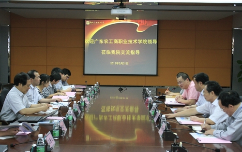 2012年5月31日上午,广东农工商职业技术学院院长黄伦生带队的一行16人来我院考察交流,我院石令明院长、熊文华副院长、党委办公室瞿凡主任、教务与实训管理处黄海国副处长、继续教育中心周继春副主任等热情接待了来访客人。