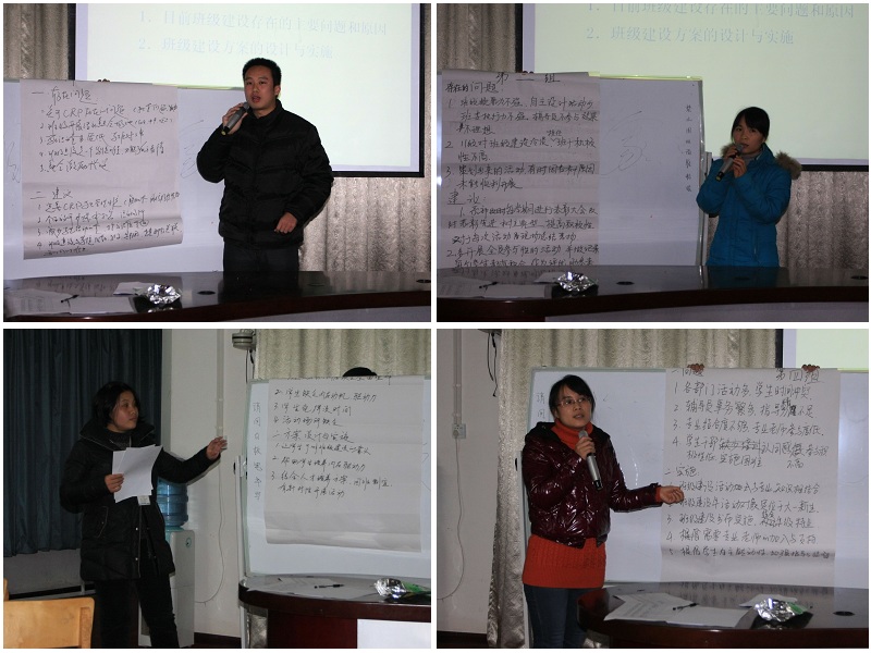 本次研讨会采用小组研讨的方式进行,与会人员共分成四个小组,针对“目前我院班级建设存在的问题及原因”、“如何设计和实施班级建设方案”两个议题进行研讨,小组成员采用头脑风暴法,集思广益,全员参与,最终汇总出小组意见。在研讨过程中,各小组讨论气氛热烈,组员参与的积极性很高,辅导员们从各自的工作实际出发,积极发表意见,研讨结束时不少辅导员还觉得意犹未尽。小组研讨结束后,各小组派出一名代表展示和阐述本组的讨论结果,各小组结合实际情况从不同角度阐述的观点和看法,获得了阵阵掌声。
