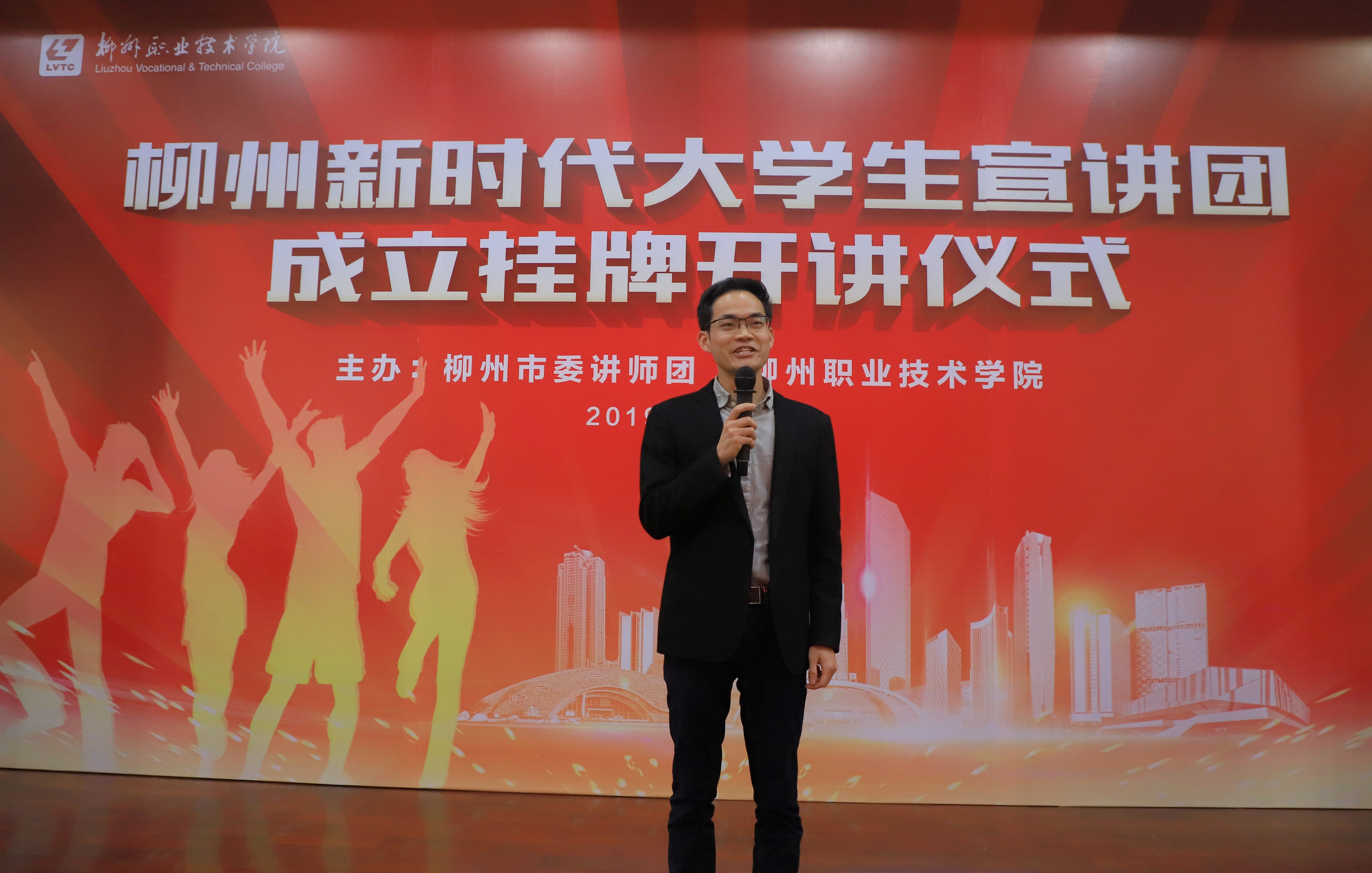 新闻网消息(文/党委宣传部 赵佃学 图/大通社 韦仁祖)2019年12月18日下午,我校与柳州市委讲师团共同组建成立的柳州新时代大学生宣讲团成立挂牌开讲仪式在我校社湾校区行政楼100报告厅举行。