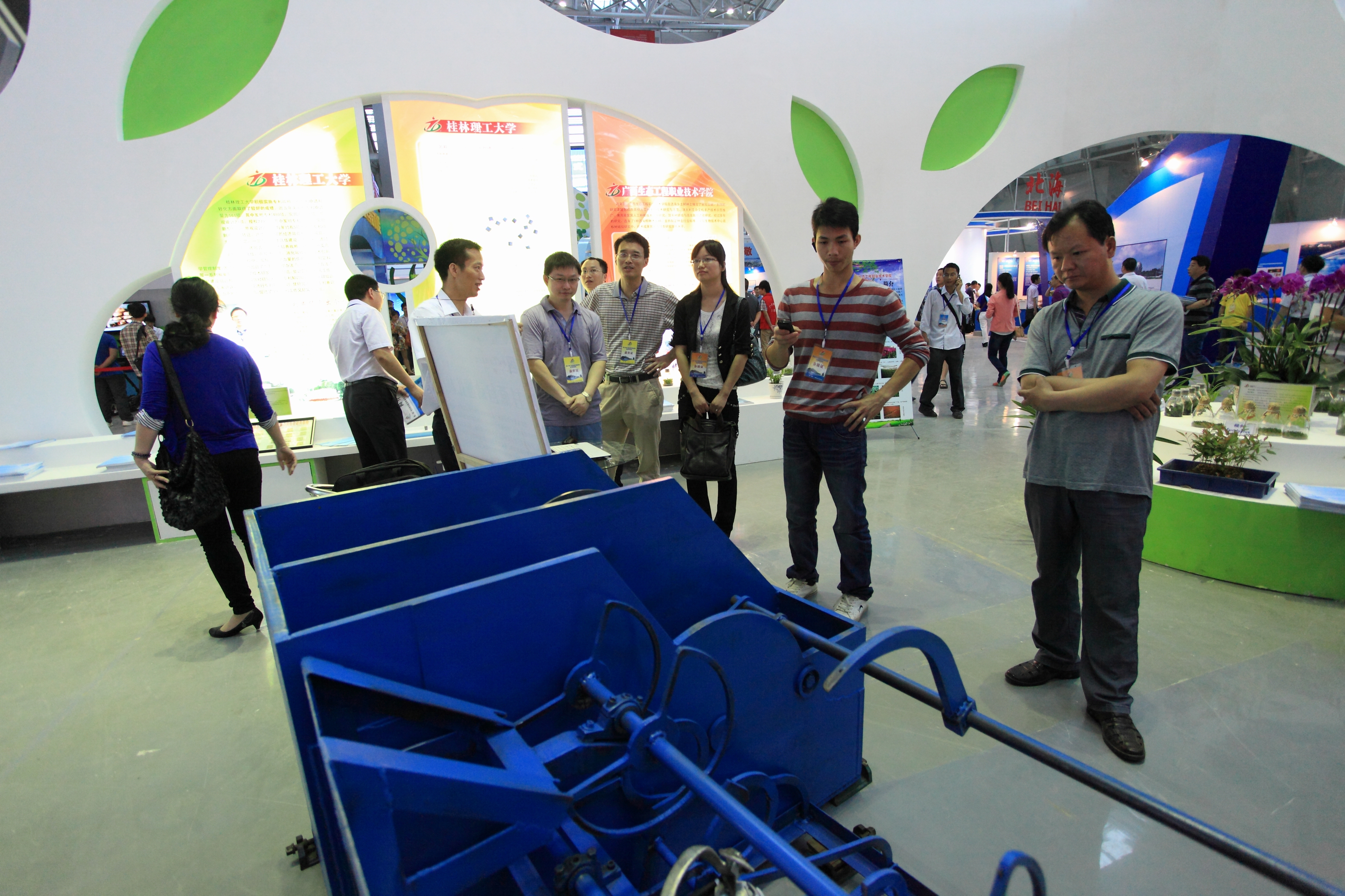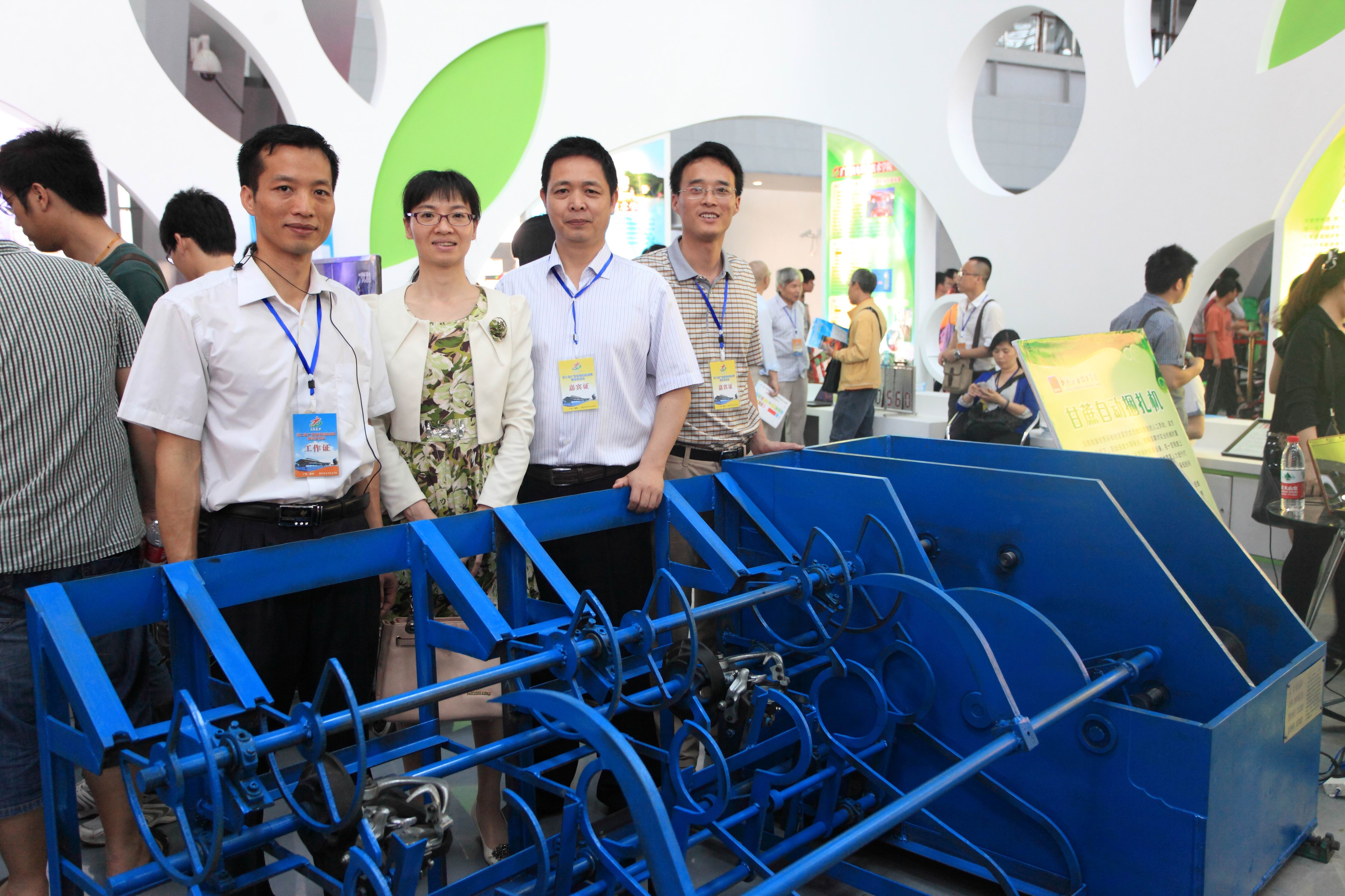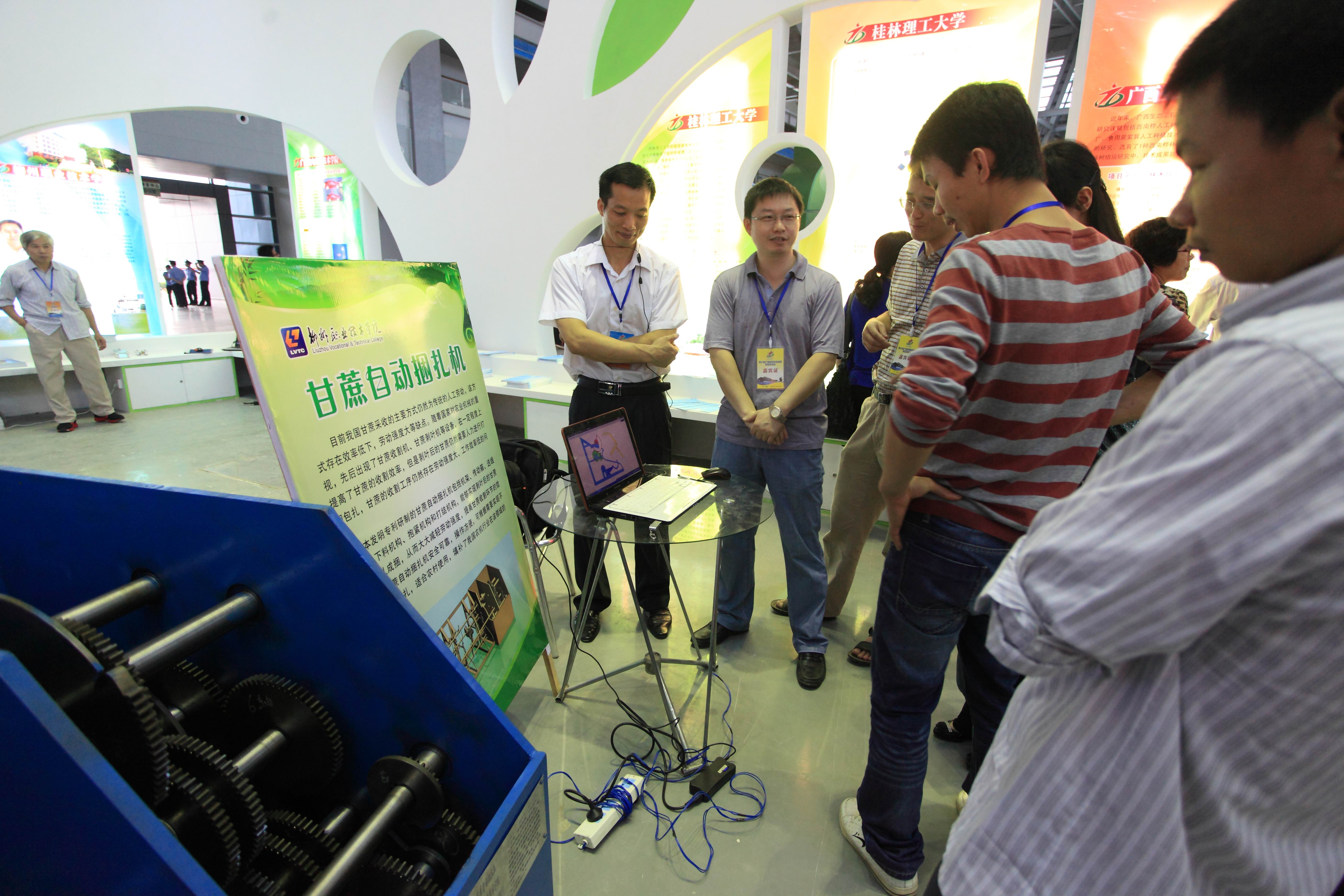 甘蔗捆扎机在第二届广西科技发明成果展交会上大出风头,引来众多的咨询者。图中人左起:李骏鹏、贺晓华、刘光浩。