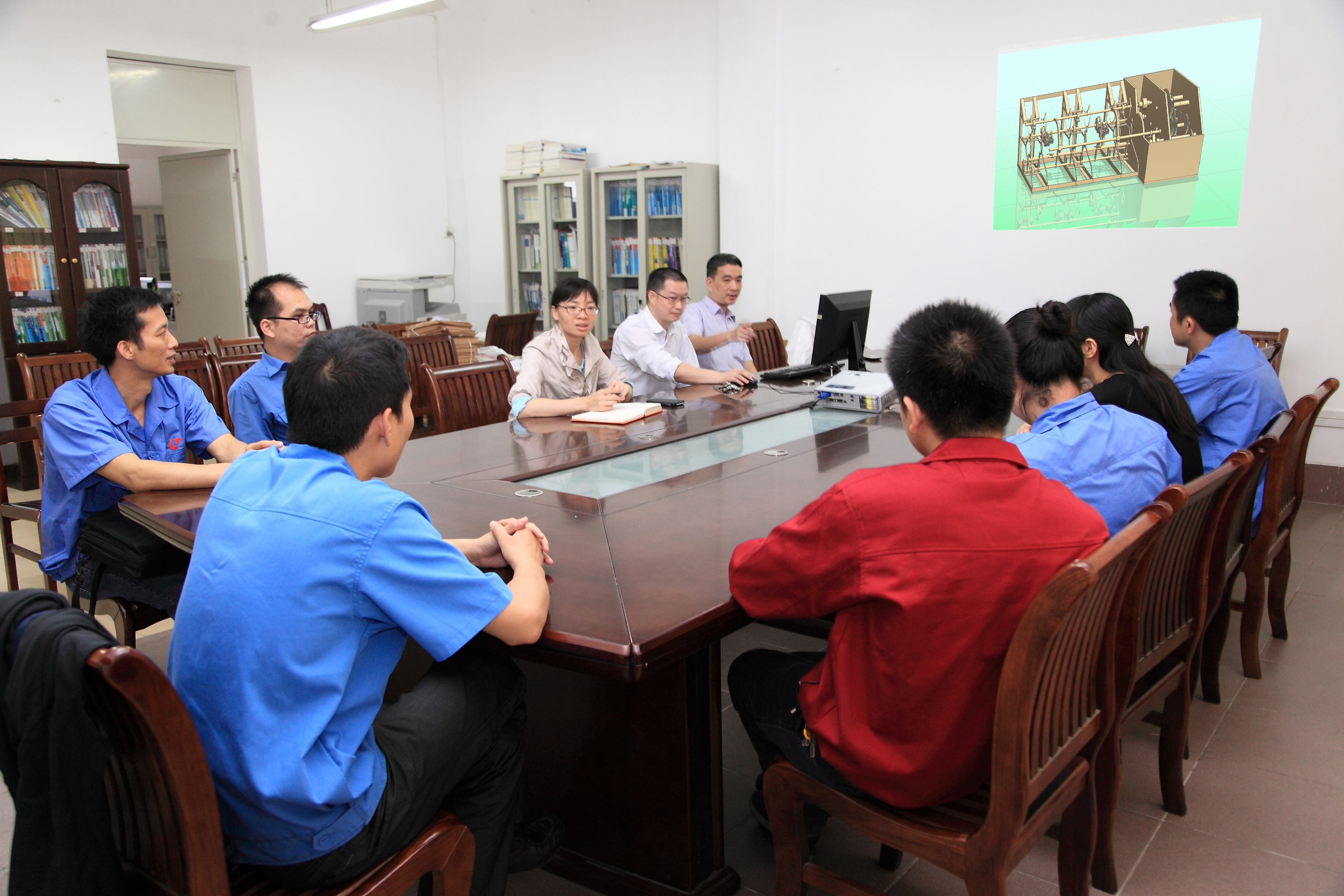 说干就干!一个年轻、高素质、高技能的研发团队组成了,主创人员有系主任韦林及贺晓华、王富春、刘光浩、苏磊、叶青等十余位老师。这是一支团结、高效、务实的团队!作为团队负责人,韦林具体负责组织协调、控制项目进度、与企业沟通、人员组织、资源调配等工作;贺晓华考虑问题比较全面,善用发散性思维,产品的功能方案和传动方案基本由他完成;他与认真、负责、“经常想出一些好主意来”的王富春是老搭档,两人配合默契,从设计到加工、组装的过程中,每遇思维短路,大家碰碰头,智慧的火花又激情闪现,困难得以攻克;刘光浩基本功比较扎实,计算类的活儿就交给他来完成;在贺晓华看来,80后女孩苏磊是一位认真、有责任心、吃得苦、不计较的女孩。贺晓华说:“你交待她一个事情,她哪怕熬夜都会给你弄出来。”而做事有条不紊、细致规范的叶青则负责后期的表格和工程图的制作……在试制样机的最后阶段,柳职院机械厂的一些老师也积极加入到项目进程中来。为完成项目,有的老师在学校一呆就是18个小时,加班加点是常事。由于睡眠太少,贺晓华的喉咙至今还是沙哑状态,但再苦再累,他们从未想过要放弃,并坚信项目在大家的齐心协力下一定能够完成。学院也大力支持项目的研发,特意下拔两万元研发制作资金,还调过来一台最高配置的电脑给研发团队专用。副院长熊文华、科技开发处处长谭界忠非常关心项目的进展,经常到现场给予指导。
