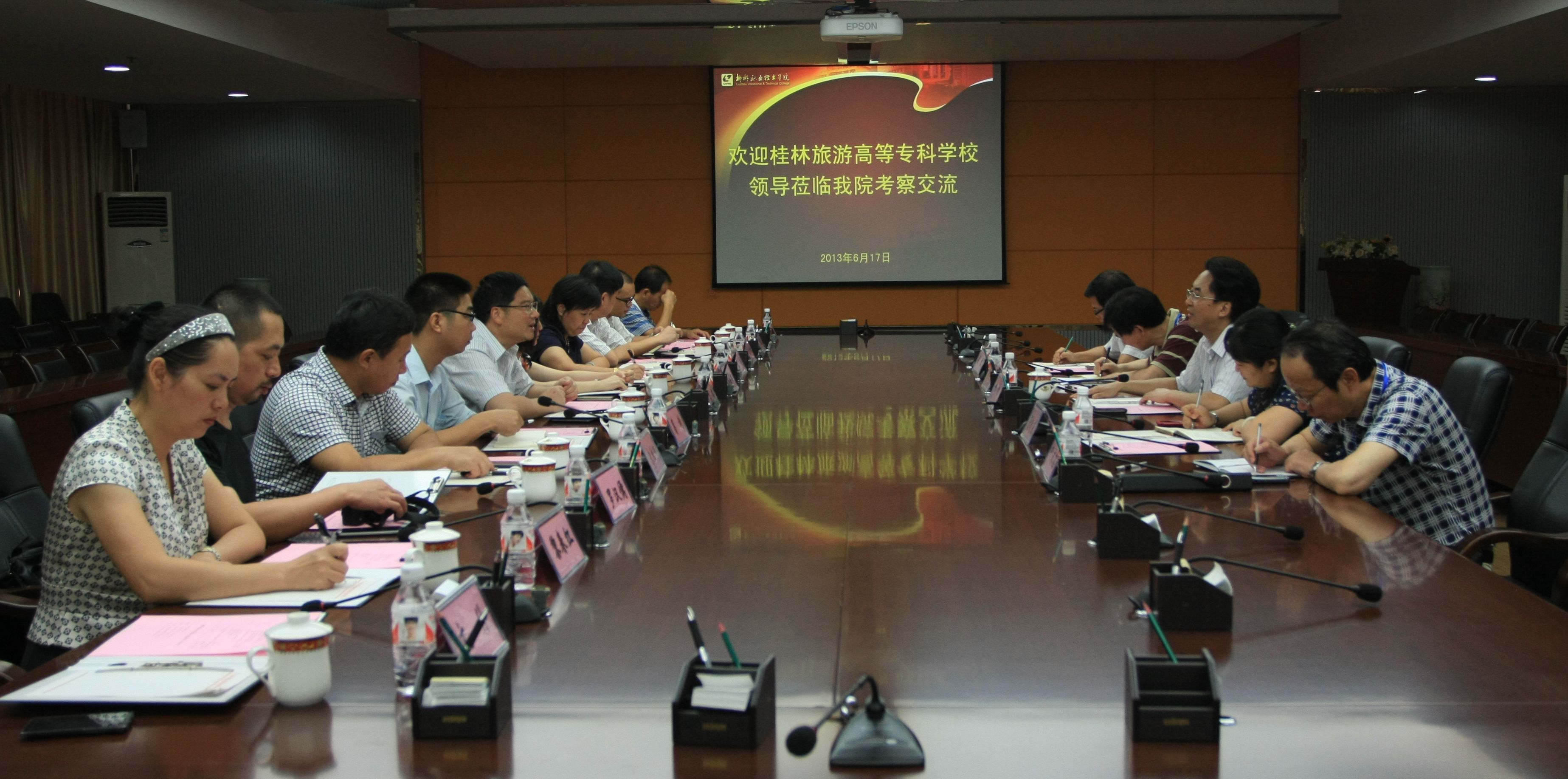 2013年6月17日上午,桂林旅游高等专科学校党委副书记蒋伟一行11人来我院考察交流,我院党委副书记阳旭及学生工作处、贸易与旅游管理系、艺术设计系等部门负责人热情接待了来访客人。