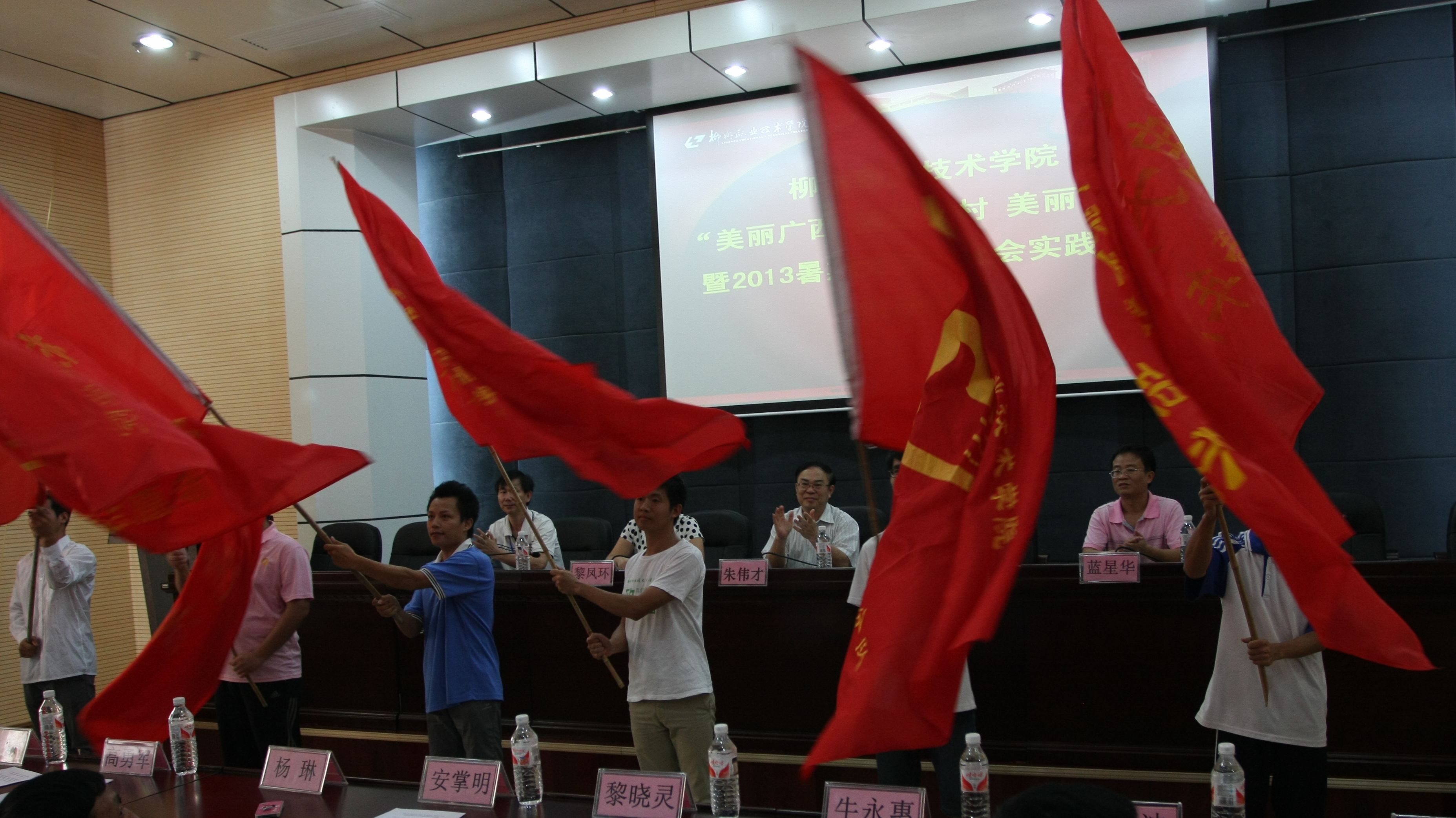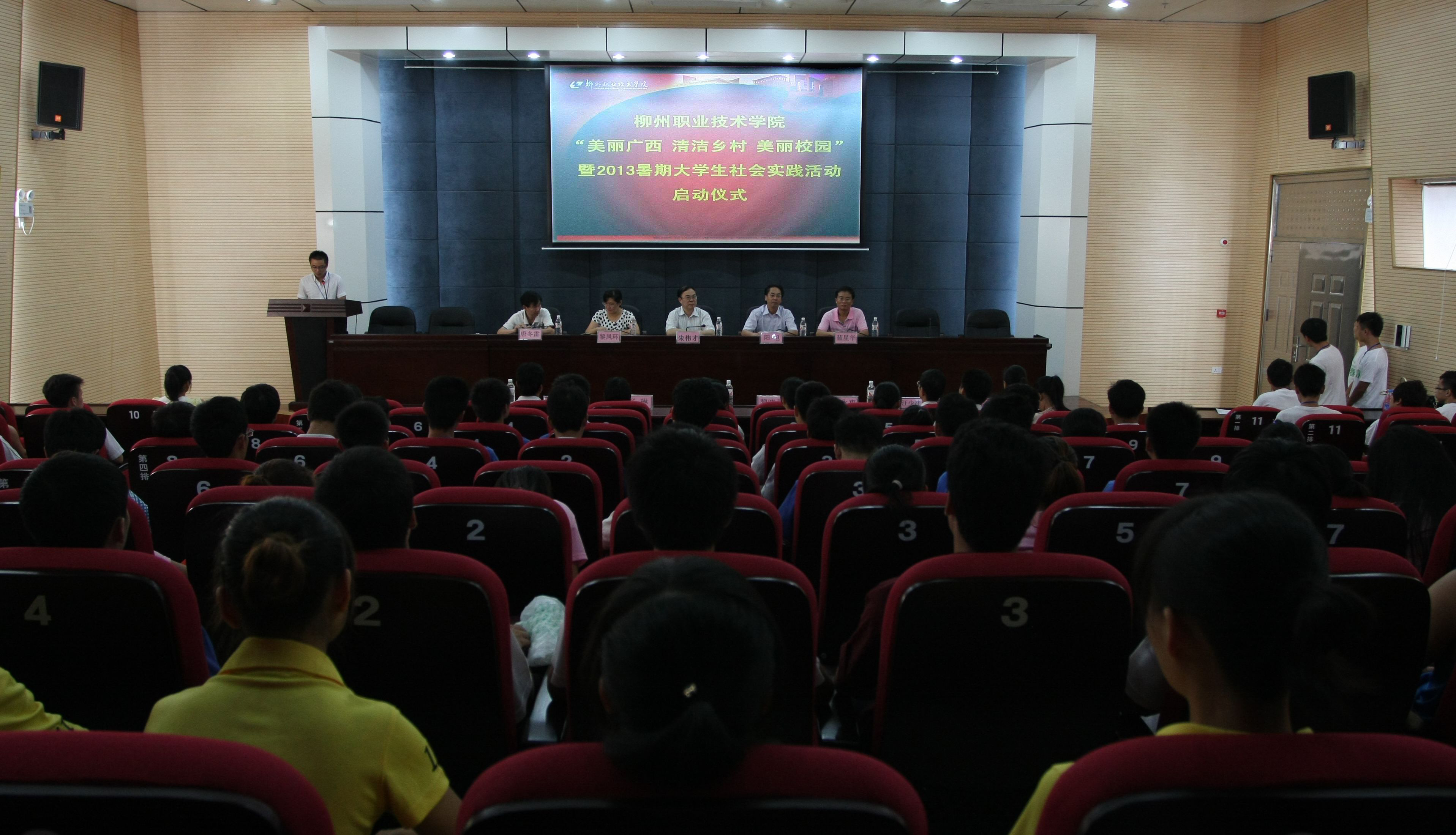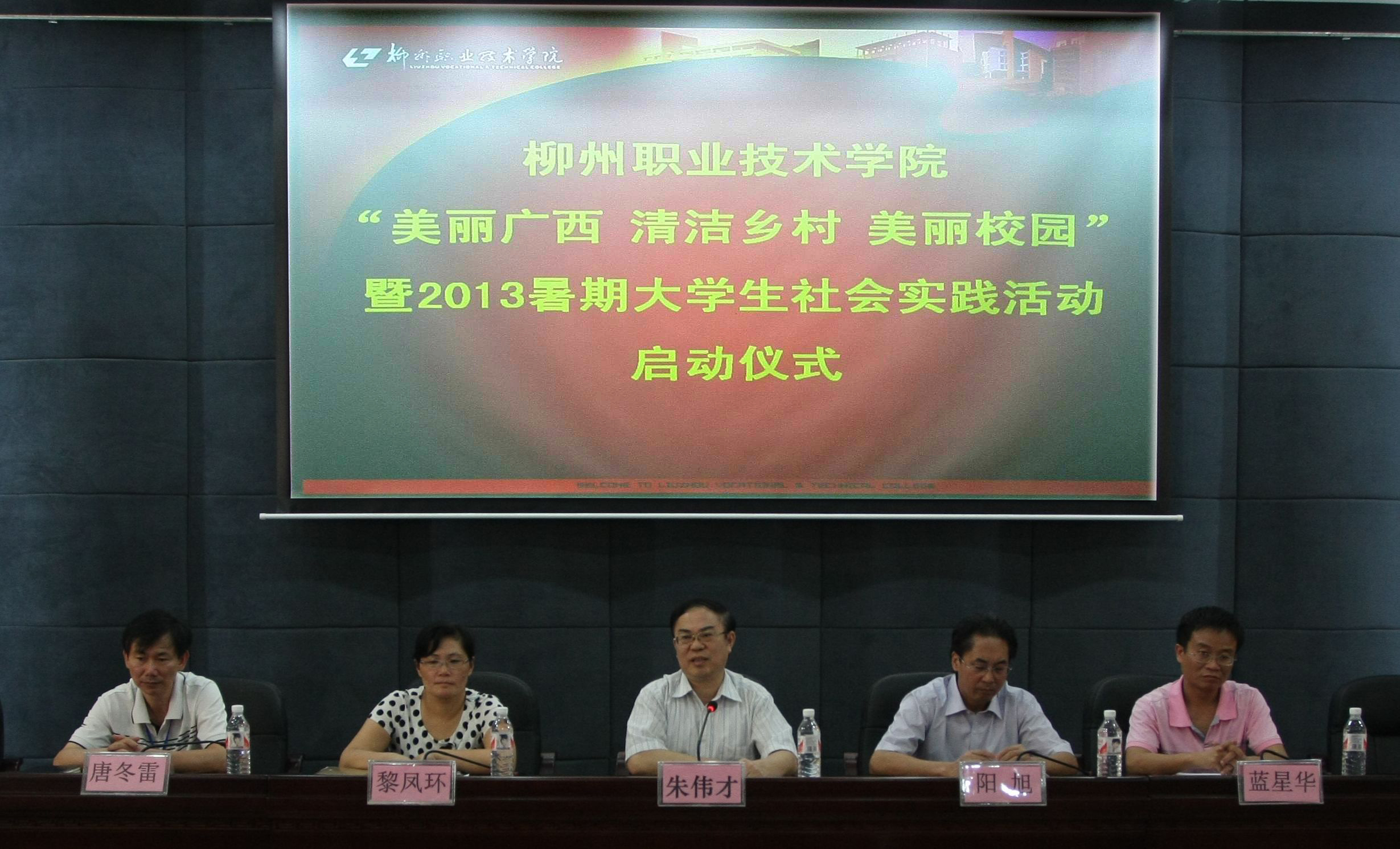 2013年7月5日下午,由学院学生工作处、团委共同举办的“美丽广西、清洁乡村、美丽校园”活动暨2013年暑期大学生社会实践活动启动仪式,在行政楼100会议室隆重举行。学院党委书记朱伟才、副书记阳旭与党委组织部、宣传部、学生工作部主要领导及各系党总支书记、副书记出席本次启动仪式。此外,院团委领导、各系分团委老师以及各班级代表共170多人参加了启动仪式。仪式由团委办公室主任杨小浒主持。