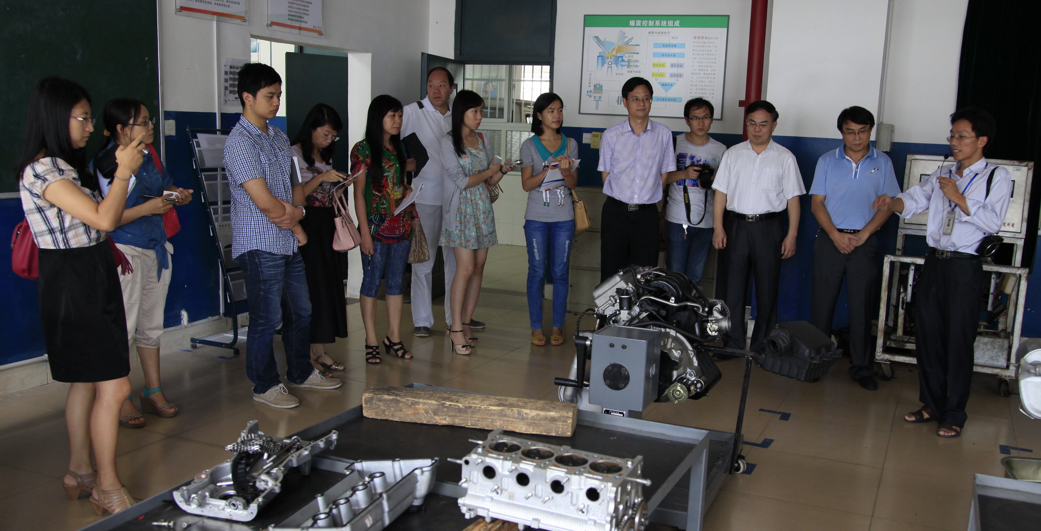 众记者在汽车工程系实训基地采访、拍照