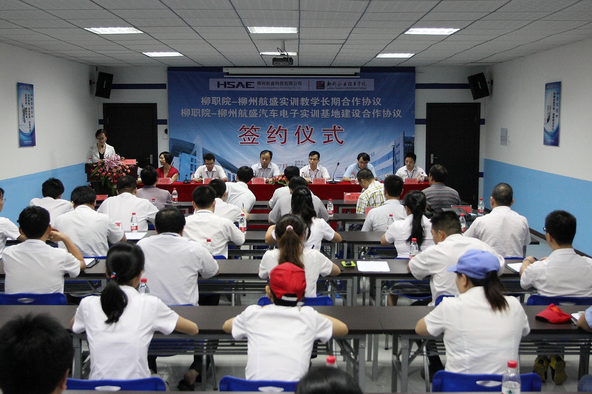 暑假期间,为了更好的推进柳州市千万元设备值生产性实训基地——汽车电子生产性实训基地项目建设工作,7月22日下午,柳州职业技术学院与柳州航盛科技有限公司的校企合作签约仪式在柳州市白露工业园区柳州航盛科技有限公司厂区二楼多媒体教室隆重举行。