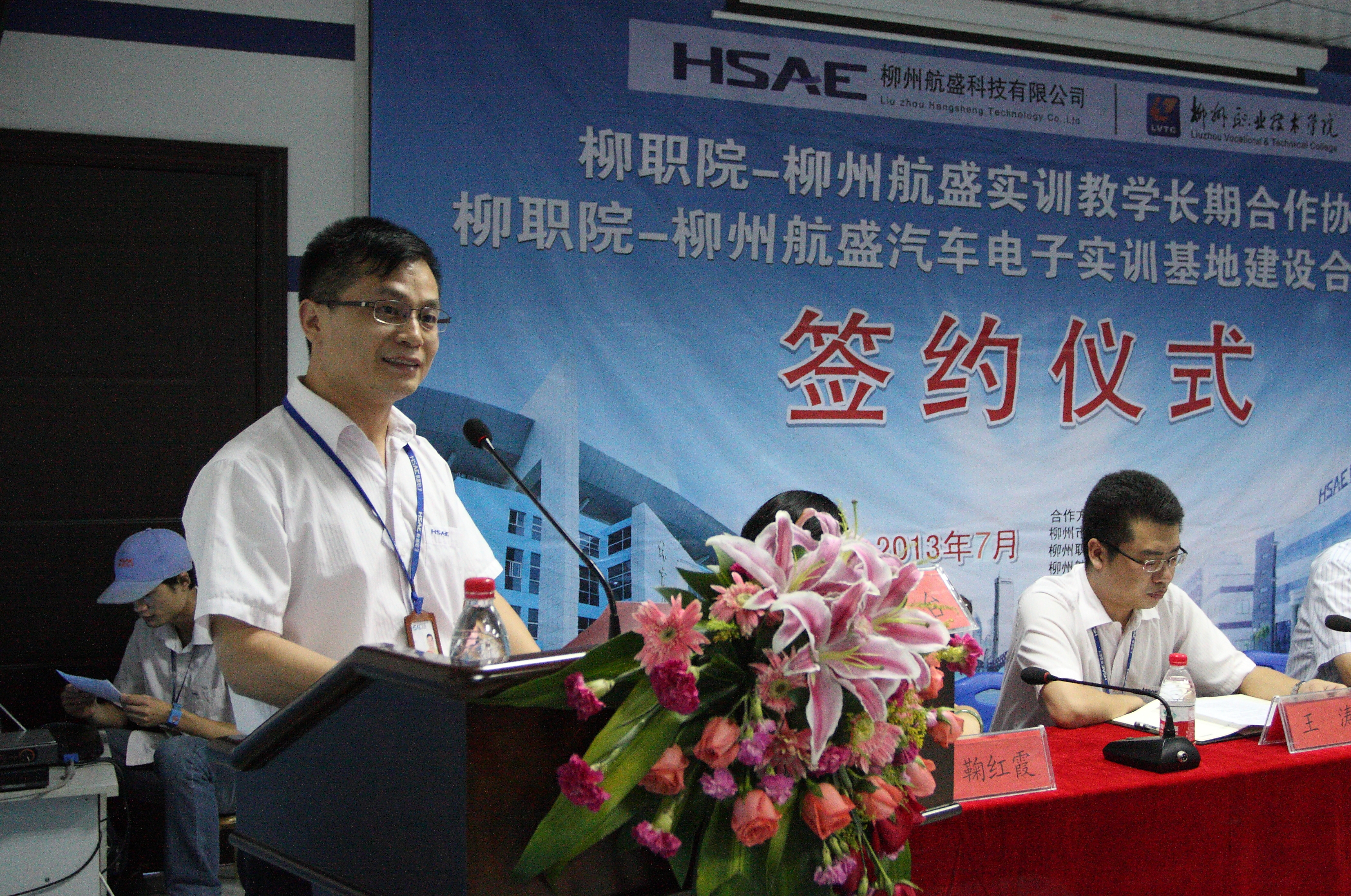 柳州职业技术学院院长石令明、副院长林若森,柳州航盛科技有限公司总经理郭永庚、副总经理王涛和刘啟斌等参加了签约仪式。柳州职业技术学院电子信息工程系主任韦小波主持签约仪式。出席签约仪式的还有学院教务与实训管理处、校企合作处和电子信息工程系相关领导,以及企业方总经理助理及相关部门主要负责人。
