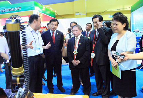 自治区副主席李康(右一)陪同国家教育部副部长杜占元(左二),柬埔寨王国教育青年体育部部长尹赛迪(左三),泰王国教育部部长差图龙•蔡桑(右二)等国内外官员参观了我院展位,石令明院长详细介绍我院数字化设计与制造设备情况。