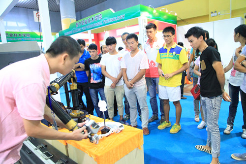 “哇,柳州职业技术学院有3D打印啵,好牛哦,快点过来看看”。“很多学校、企业还没有用上3D打印,你们有了,你们太强大了”。一批又一批在校学生、社会各界人士、外国友人围在数字化设计与制造设备前,仔细观看3D打印过程,不停在拍照、议论,对学院办学实力、对学院学生拥有如此先进的实训条件惊叹不已。机电工程系龚荣老师不厌其烦、详细、耐心对三坐标扫描仪、3D打印设备和3D打印样品等三个主要部分进行介绍,宣传3D打印的一些基本知识,让他们了解3D打印的发展趋势……一时间,我院的3D打印设备引来众人“围观”,柳职院展区一时成了热门的看点。(文/蓝星华 图/朱敬民)