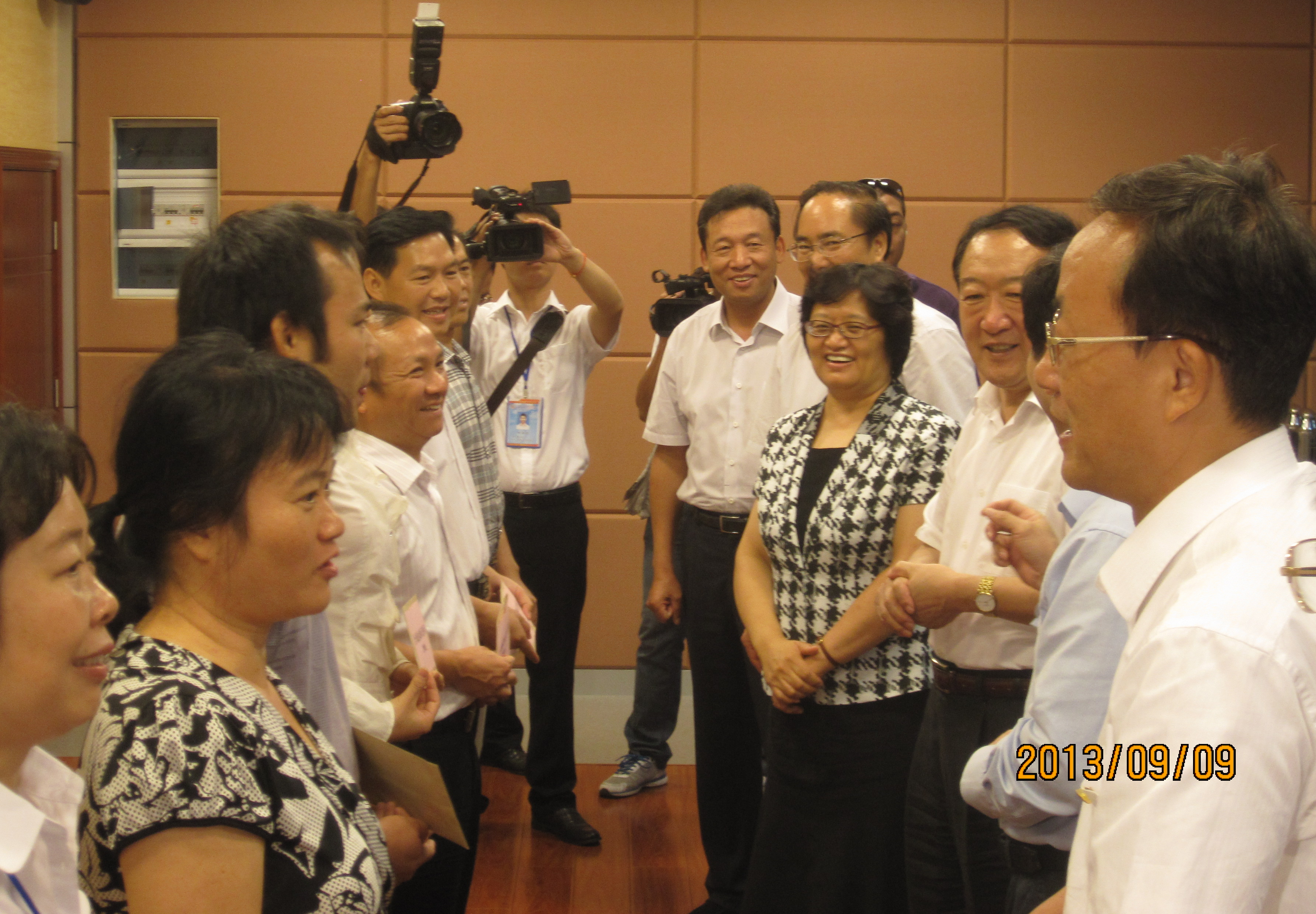 新闻网消息:(记者 崔智慧 图 鞠红霞 )2013年9月9日上午,在第29个教师节来临前夕,全国政协教科文卫体委员会教师节慰问座谈会在南宁市第六职业技术学校热烈召开。由全国政协副主席苏荣、全国政协委员、教科文卫体委员会副主任、教育部副部长李卫红等20多名领导组成的慰问团成员以及自治区党委常委、自治区人民政府常务副主席黄道伟等自治区、南宁市有关领导出席了座谈会。