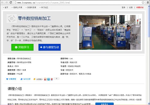 从国家爱课程网(http://www.icourses.cn/home/)获悉,我院的《零件数控铣削加工》已于2013年10月12日成功上线。